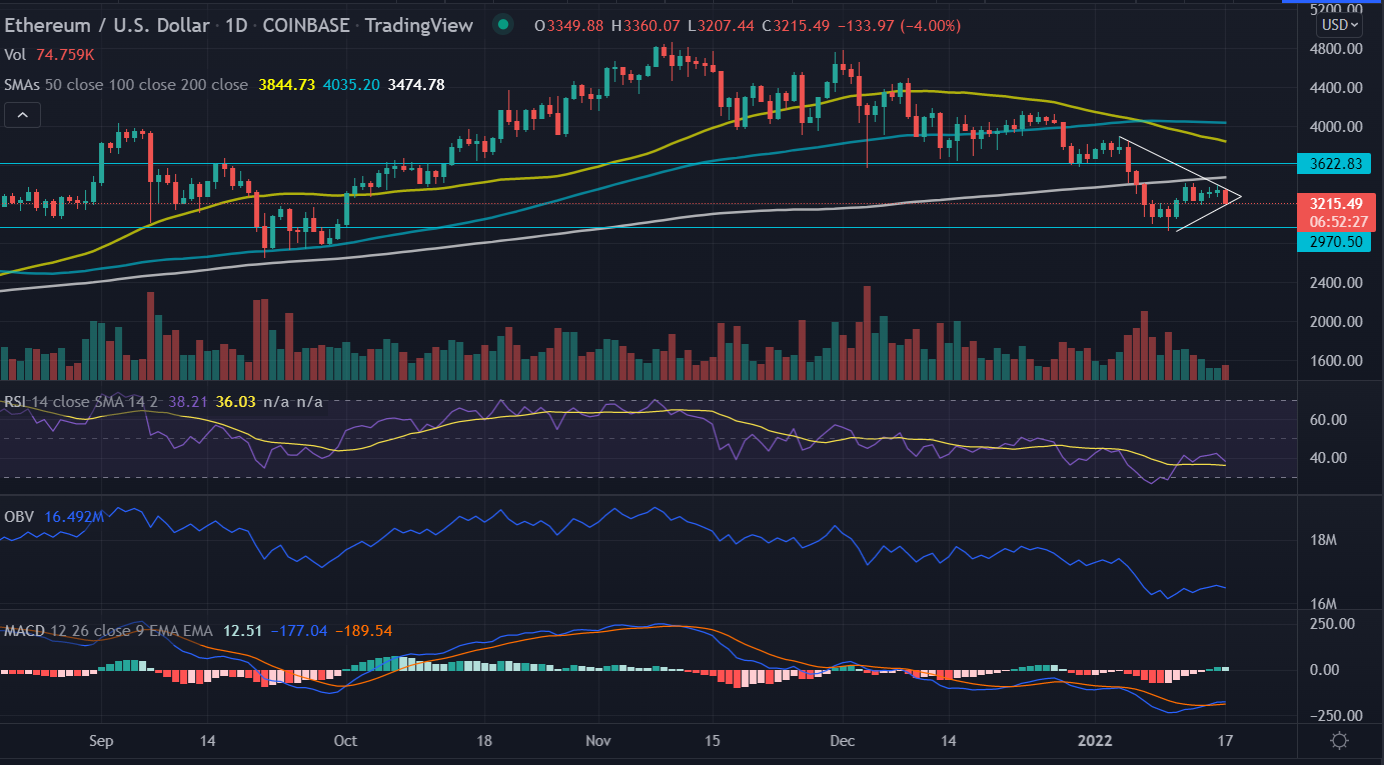 Ethereum (ETH) price takes round in a tight trading range inside pennant formation with signals pointing to the downside as bulls fail to hold onto the recent gains extending from the lows of January 9. However, the fight between market forces keeps prices swinging in the range of $32k and $34k.