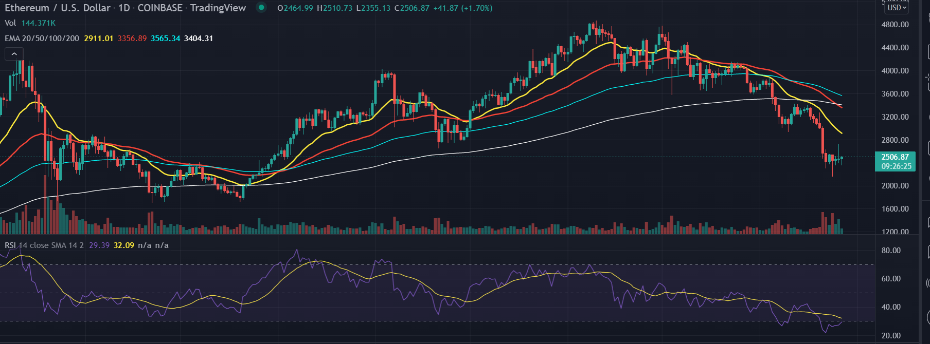 Any uptick in the indicator will bring fresh buying opportunities for the long waiting buyers. The interim target is placed at $2,800. A decisive break above the 50/100/200 EMA at $3,600 could see the bulls craving further for $4,000.