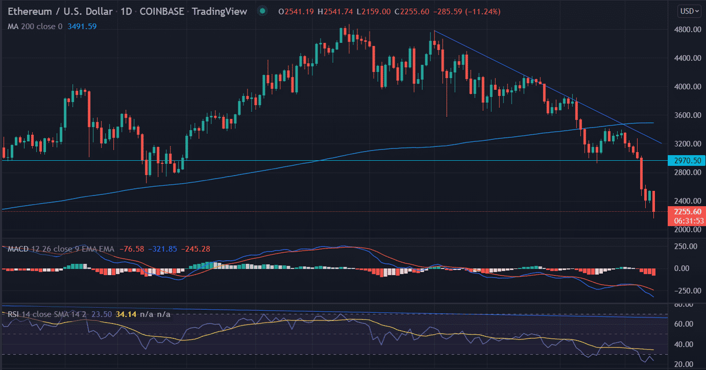 At the time of writing, ETH/USD trades at $2,225.10, down 12% on the day.