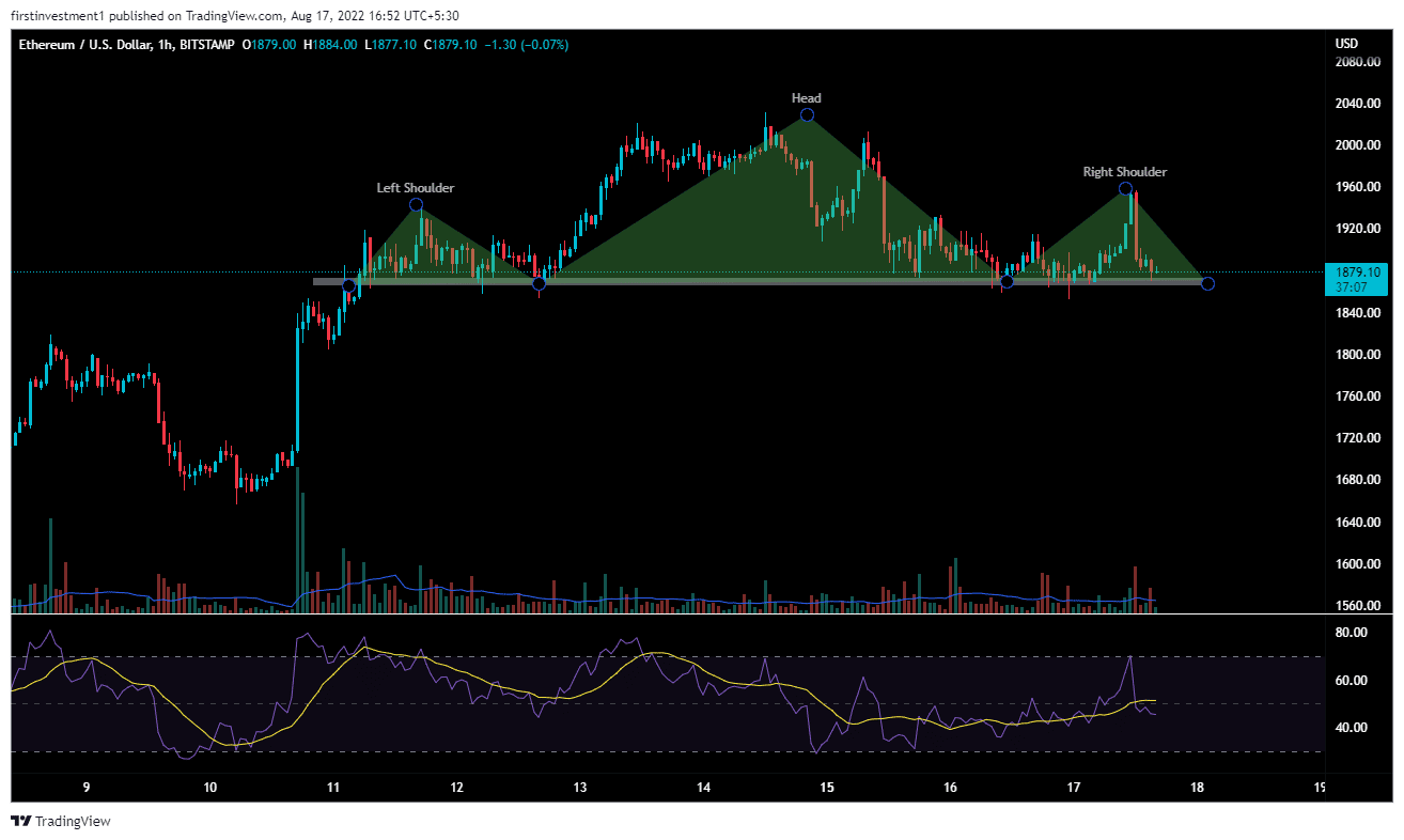 ETH on one hour chart is forming a “Head & Shoulder ” pattern. The neckline is at $1,865. If that level broke and gave a closing below this level on an hourly time frame, then we can expect a good fall of up to $1,750.