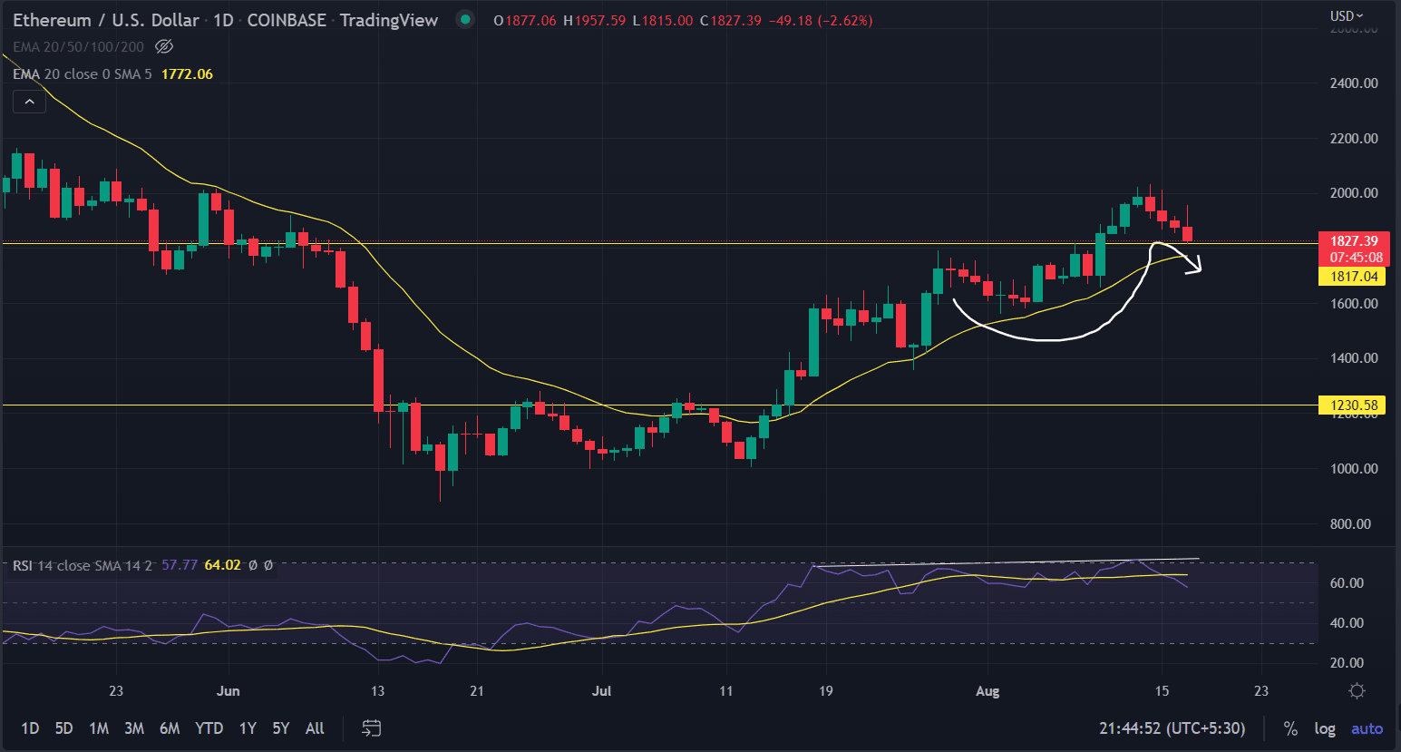 Ethereum price analysis imprints a negative view for the day. The price sees a steady decline from the swing highs of $2,000 over the past four-session. It might be a much-anticipated correction or a trend reversal.