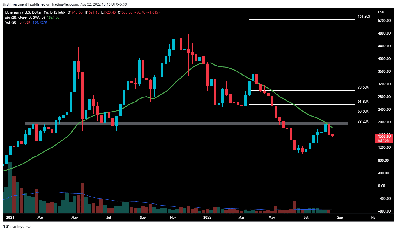 On the weekly charts, the ETH price closed above $2000 for the first time On March 29, 2021, and since then the price had made a high of $4867.