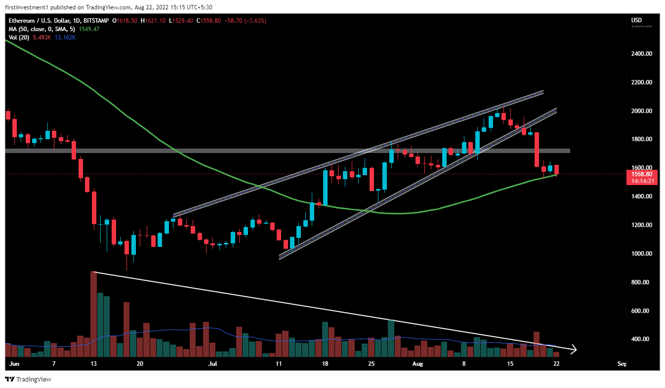 ETH produces a breakdown of the “Rising Wedge” pattern, indicating weakness around the overall look. The price was not able to break its previous swing high and is taking support near the 50-day exponential moving average. More downside, if breaches the moving average.