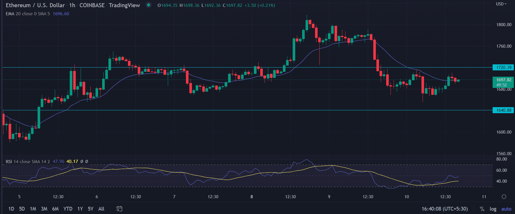 On the hourly time frame, the ETH price is struggling near the $1,690 level. This also coincides with the 20-day exponential moving average.