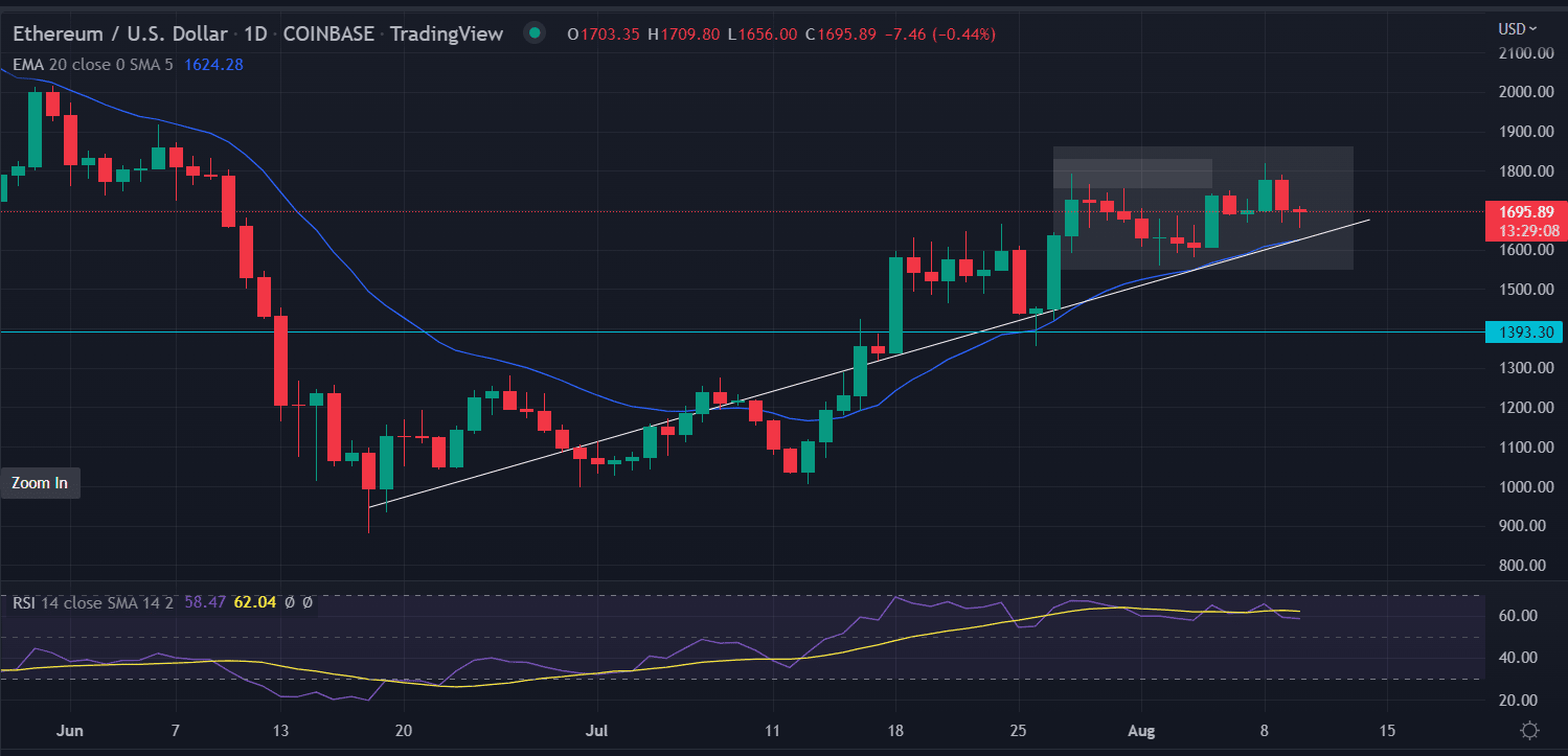 Ethereum price analysis indicates sideways movement with a neutral bias. The price is consolidating after retracing from the highs of $1,791 in the previous trading session. But, it is interesting to note that the bulls hold vital support at around $1,680.