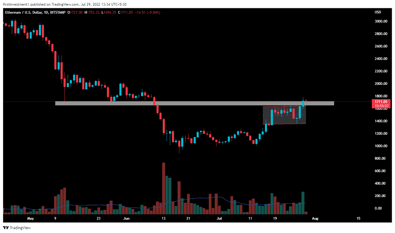 Recently, the ETH price was very volatile, with multiple Dojis formations near the $1,680 level. But, the reversal from swing lows, pushed ETH to give a breakout from its consolidation pattern. Currently, the price is moving sideways consolidating in a range near the higher level. Accumulation near higher indicates bullish sentiment might be brewing up.