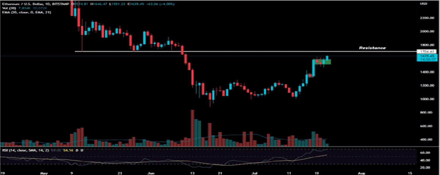 Earlier, following a short-term consolidation extending from $980 to $1,400, ETH gave a breakout on July 19. Since then the price continues to move higher. However, the momentum slows down near the higher levels.