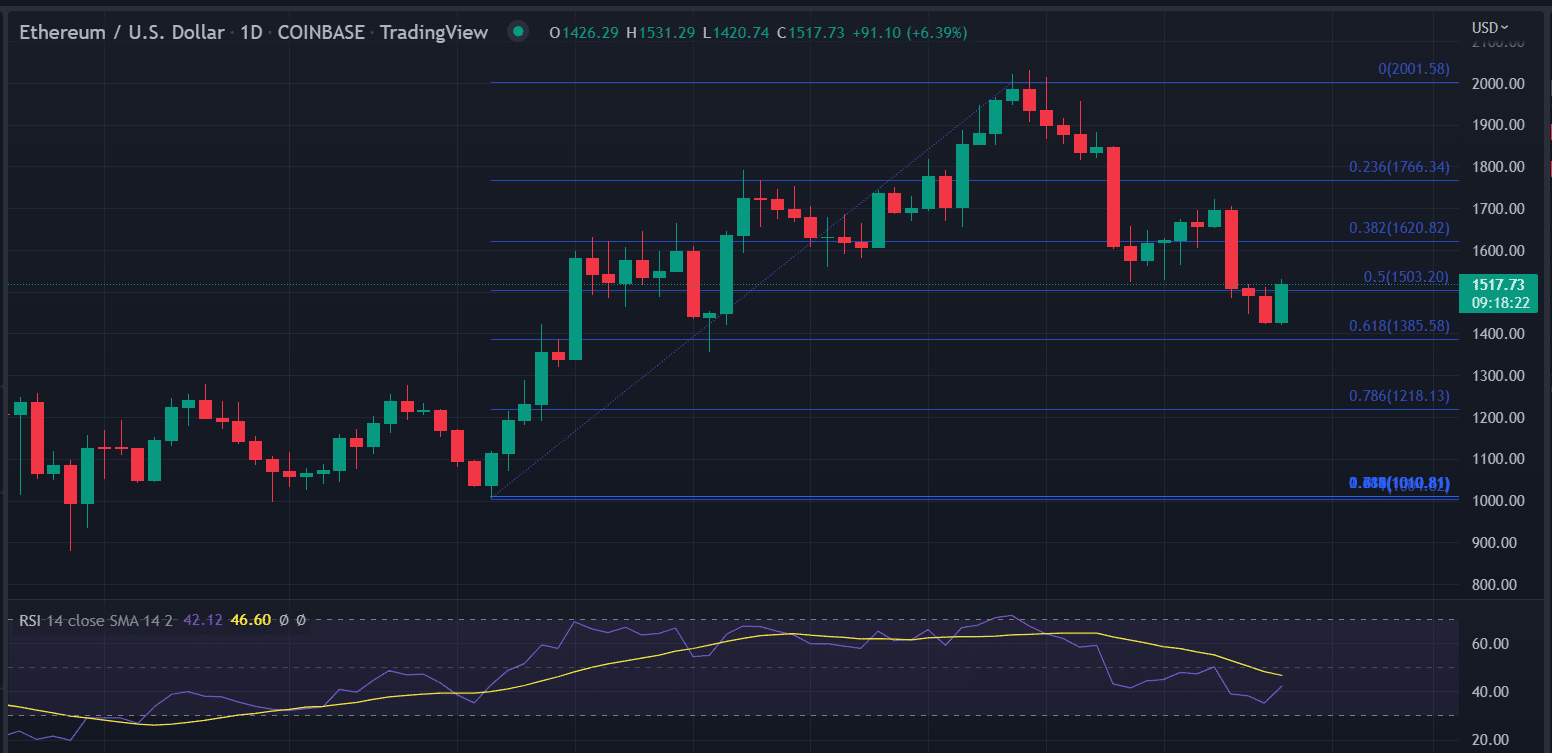 Earlier, the Ethereum price appreciated more than 100% from the lows of $$1,000. After making a swing high of $2,031.39, the price immediately retraced below $1,500. Since then, the price is making lower highs and lower lows, indicating a downside trend.