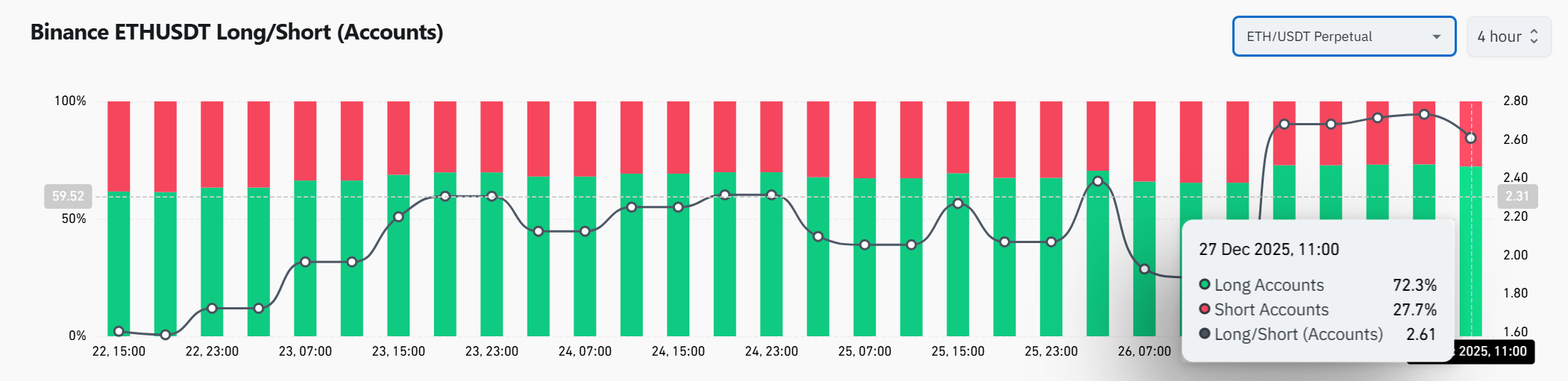Additionally, the Ethereum price action is notably in line with the derivatives positioning shifts. According to CoinGlass analytics, the long accounts dominate 72% of positions. Meanwhile, short exposure remains at 28%, reflecting directional conviction but not defensive positioning.