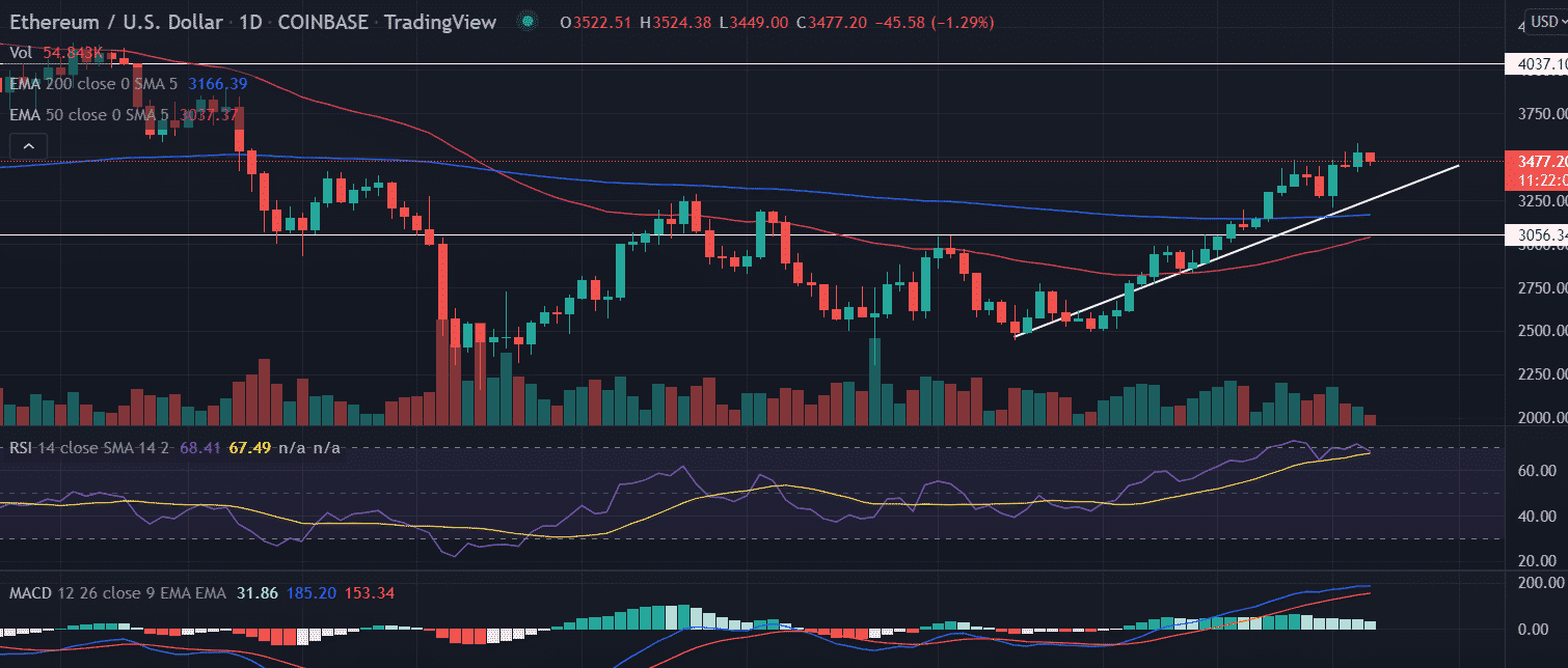 As of press time, ETH/USD trades at $3,490, down 1.01% for the day. The second-largest cryptocurrency holds the 24-hour trading volume at $16,661,637,683 as per the CoinMarketCap.