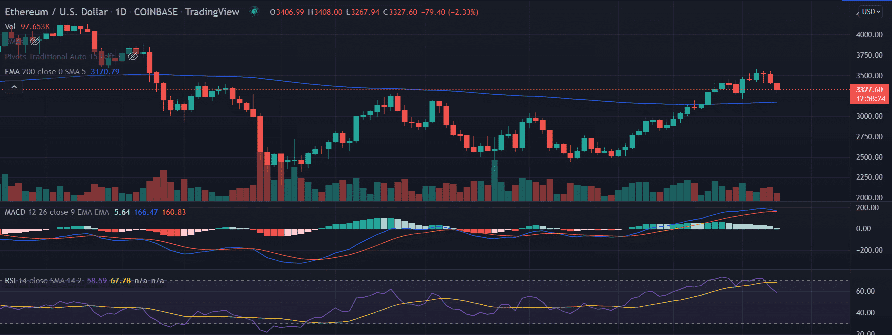 ETH price fell for the third session in a row. The price recovered from the lows and manages to trade above $3,300. Further, if the price holds above the critical 200-day EMA, it could be a hint for the next Bull Run.