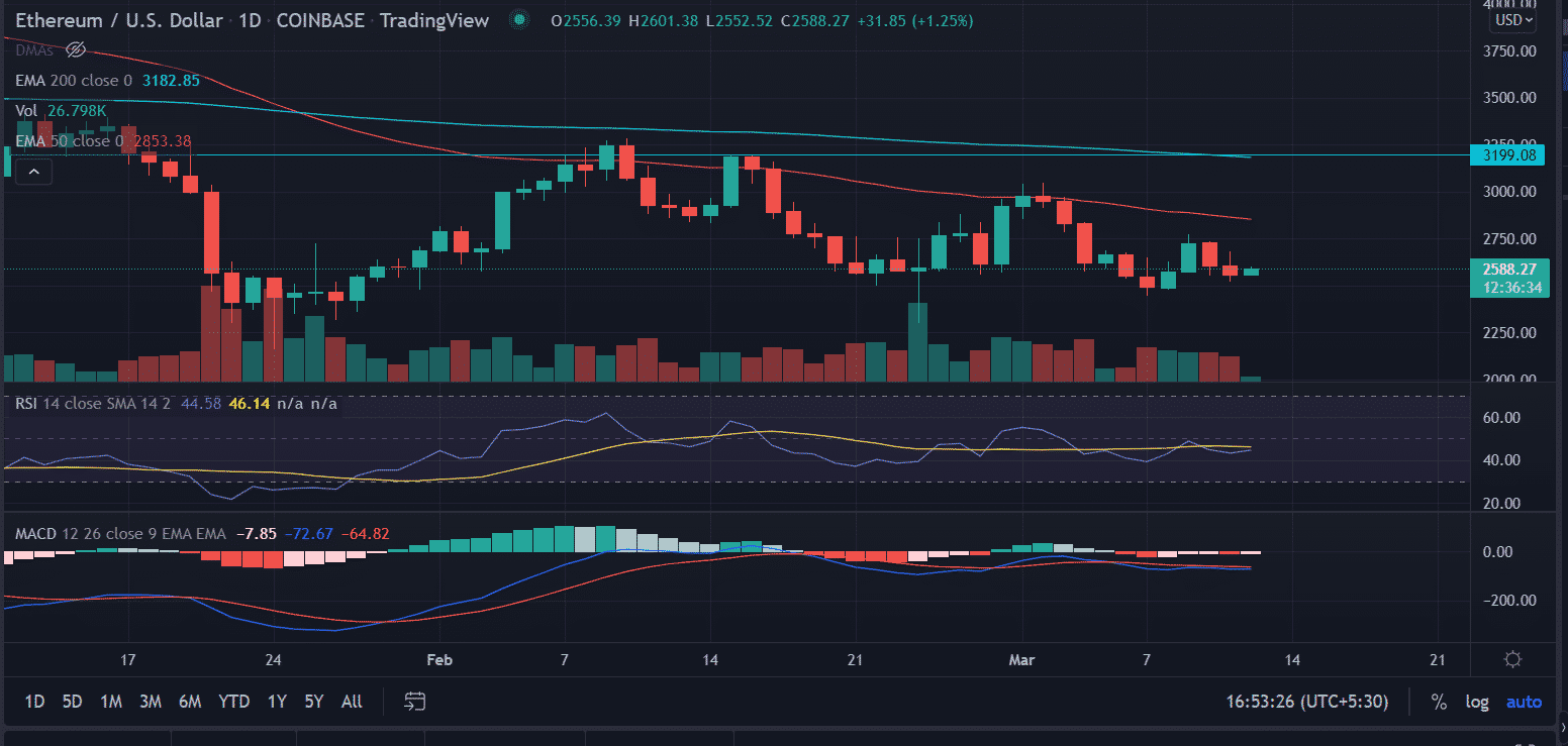 As of publication time, ETH/USD is trading at $2,587.56, up 1.21% for the day. The second-largest cryptocurrency by market cap holds 24-hour trading volume at $10,529,639,128 with more than 8% losses.