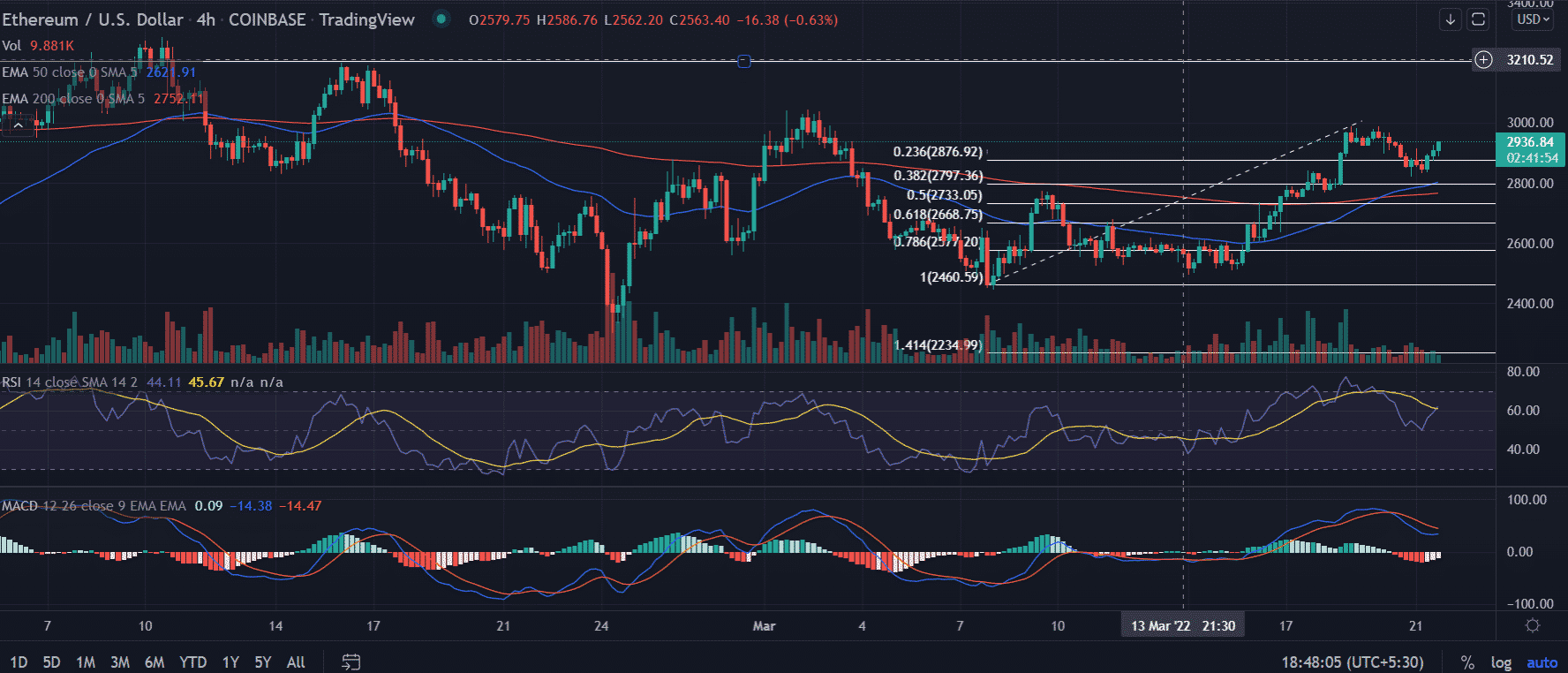 On the flip side, a fall below the 0.23% Fibonacci retracement level at $2,876.92 will reverse the current upside. On the downside, the interim target is placed at $2,795.22. Furthermore, a dive below the 200-EMA at $2,723.70 will find the support at $2,733.05.