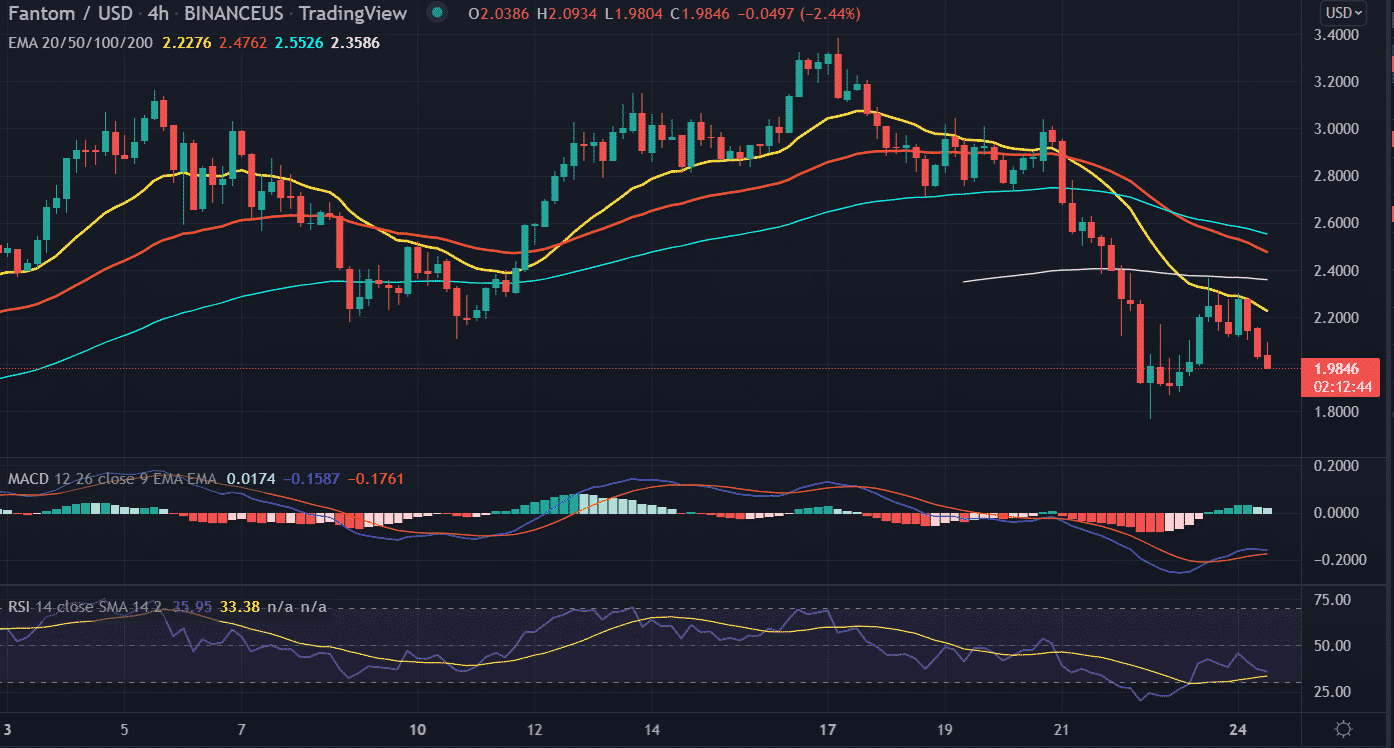 Fantom’s (FTM) price fails to capitalize on the previous day’s gain. However, FTM manages to hold the lows made on Sunday at $1.9495. The volumes also dip down to 8% at $1,714,449,297.At the time of writing, Fantom’s (FTM) price is trading at $2.0334, down 10.73%.