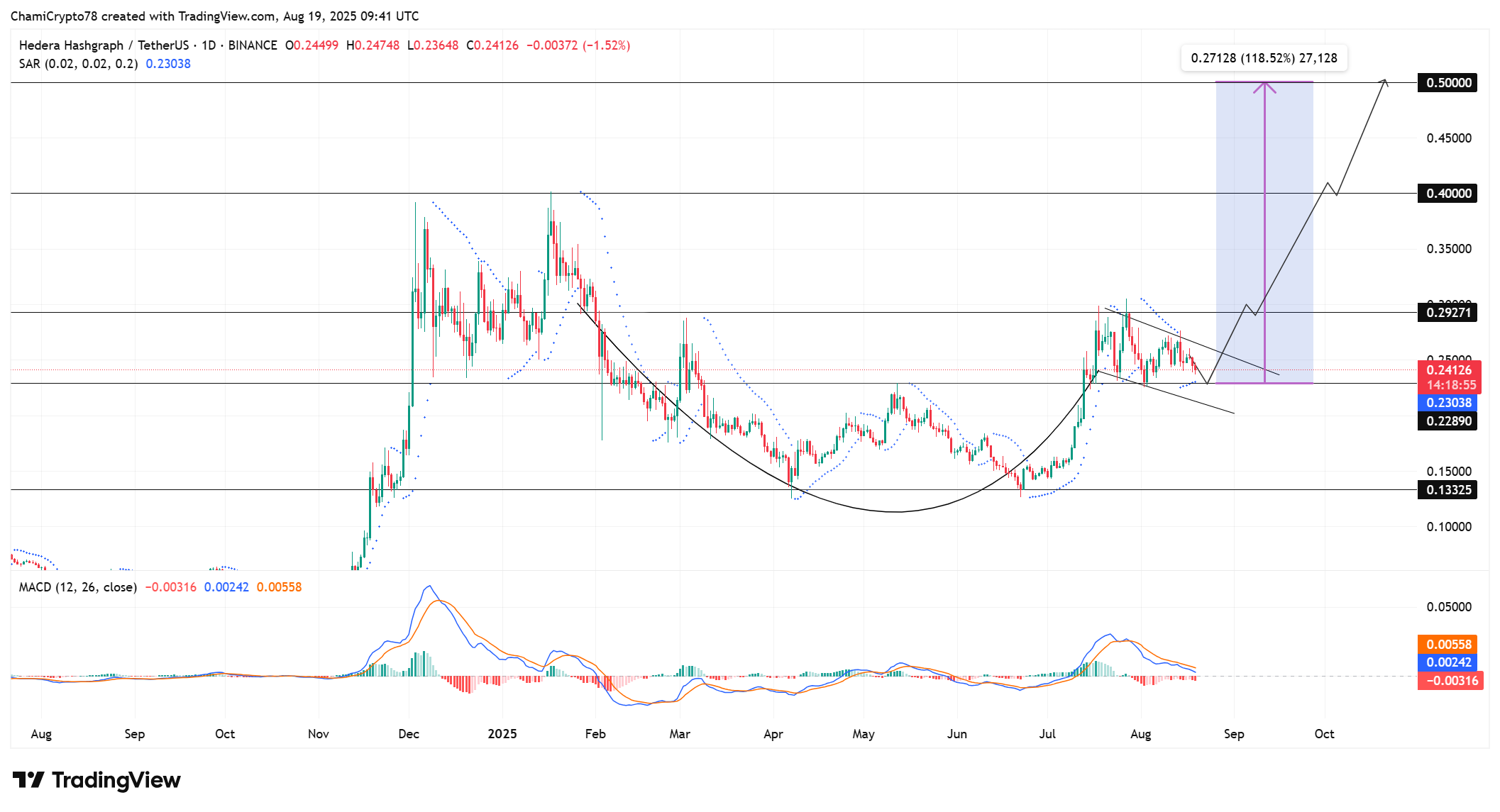 HBAR price can reach the target of 0.50 as long as the current conditions remain. The cup and handle pattern with the support of Parabolic SAR and MACD indicators are in favor of a bullish position. Moreover, the speculation of a BlackRock ETF and good long positioning support the belief of a breakout. Although there are still risks in case of support breakdown, the general picture indicates that HBAR has a definite way to $0.50 in the near future.