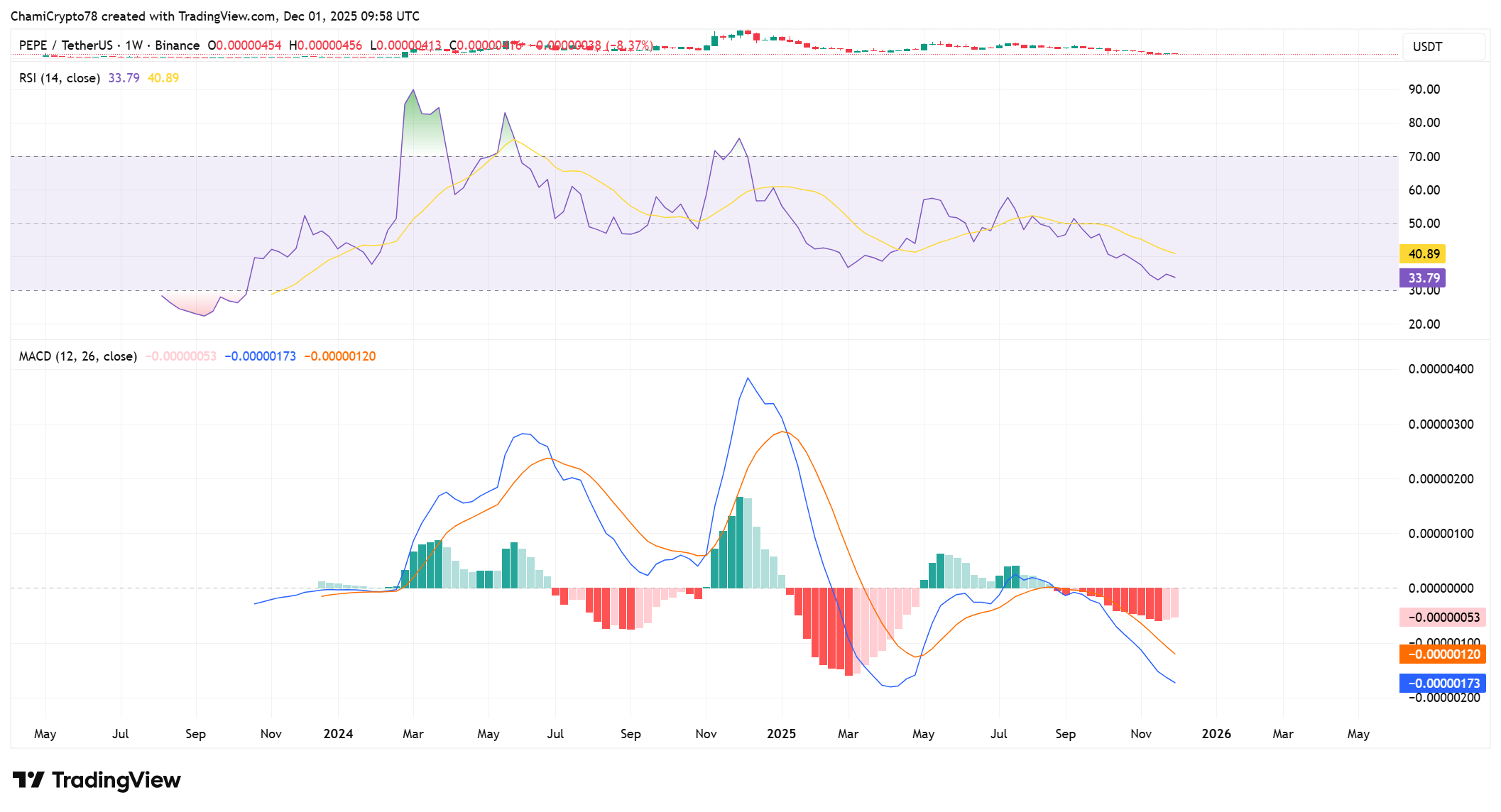 The RSI sits at 33, and this level reflects firm weakness after weeks of repeated midpoint failures. Notably, the RSI now moves close to oversold territory, yet it still refuses to trigger any meaningful buy signals. This behavior shows that buyers hesitate, and the broader mood remains heavy. Pepe price struggles whenever the indicator avoids forming early strength, and this pattern continues to guide the market tone.