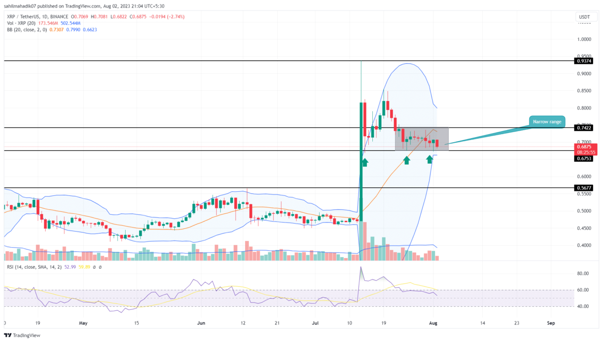 The ongoing correction phase in XRP price from suitable support at the $0.675 level. Amid the three weeks of sideways action, the coin price bounced thrice from the aforementioned level indicating the buyers are heavily protecting this support. Can this foothold replenish exhausted bullish momentum for resuming the price recovery?