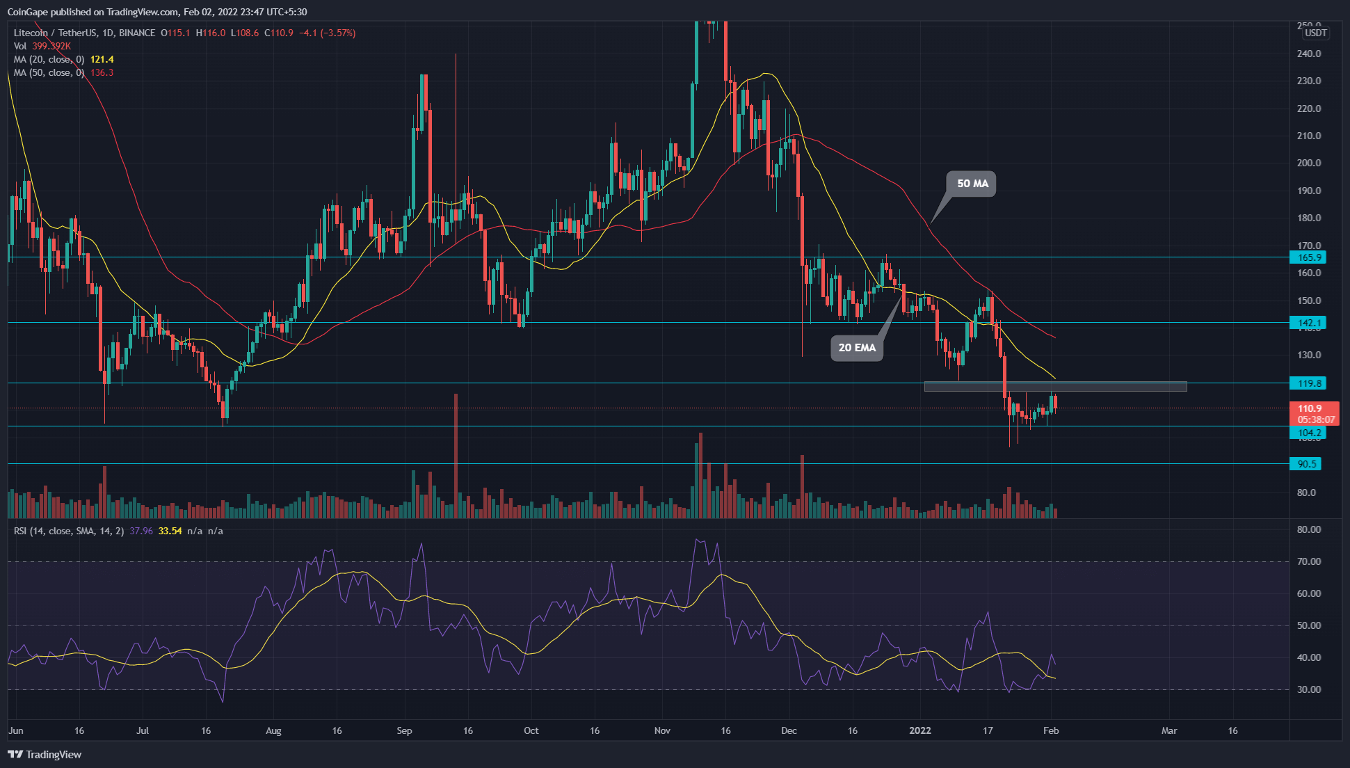 The LTC/USDT technical chart indicates an overall bearish trend. The coin price has recently plunged to the July 2021 low of $105, indicating a 64% loss from the previous swing high of $297. However, a rising daily RSI slope bolsters the bulls to initiate a recovery rally above $120 resistance.
