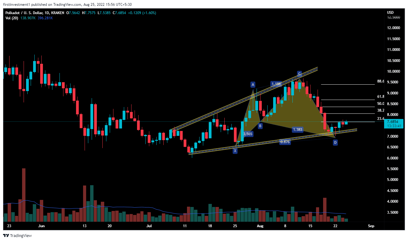Further, the Polkadot price analysis indicates the formation of a bullish “Bullish Shark” harmonic pattern. In a bullish shark pattern, however, the second top is higher than the first one. In addition, it combines Fibonacci with Elliott’s waves theory, and some new ratios like 88.6% are used. Along with this bullish pattern. The price hasn’t broken its previous swing low as well, indicating a possible reversal in the coming future.