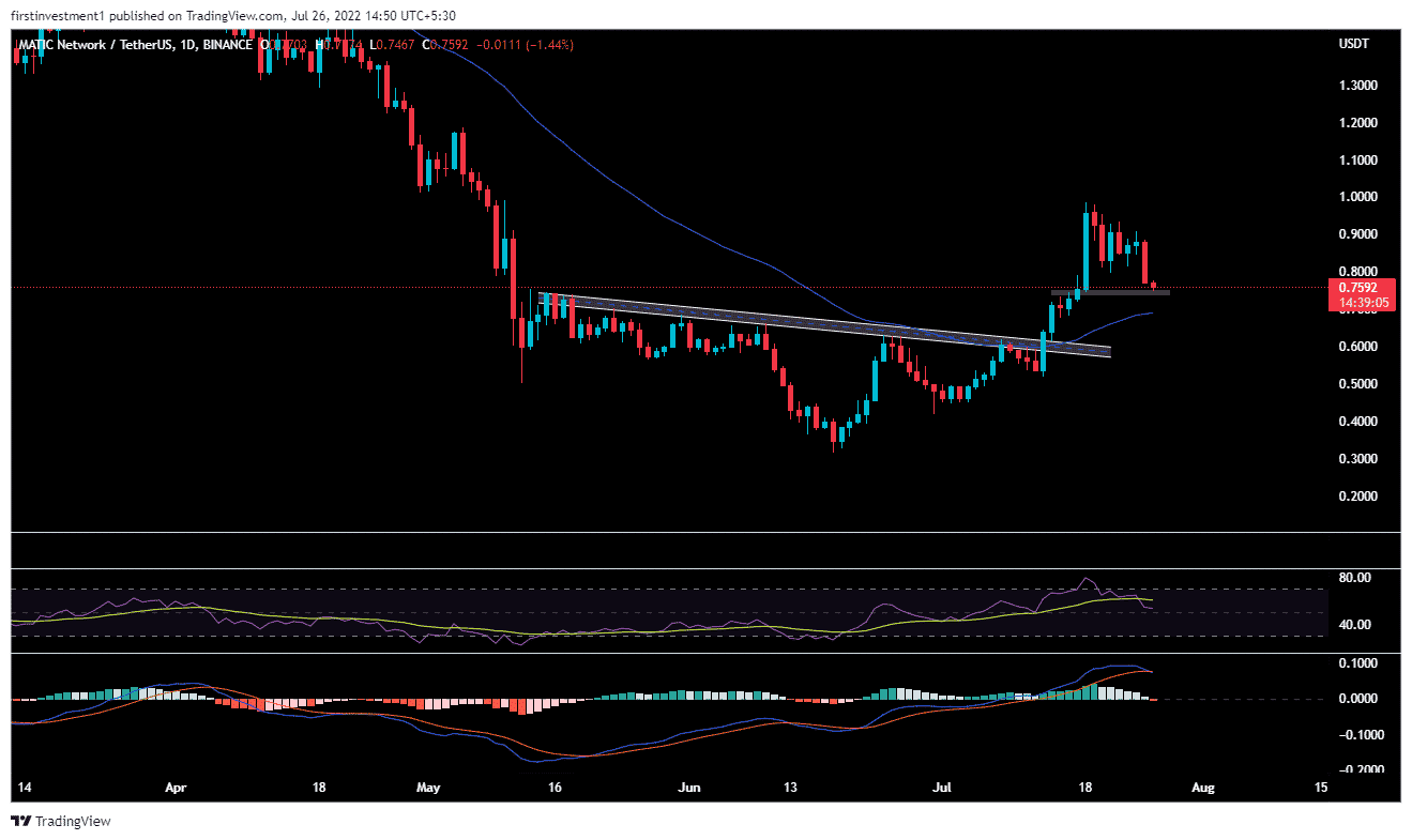 On the daily chart, the MATIC price formed an ‘Inverted Head & Shoulder’ pattern, which is a bullish formation. Finally, a breakout on July 13 resulted in an impulse move. The price tagged the high of $0.97 on July 18.