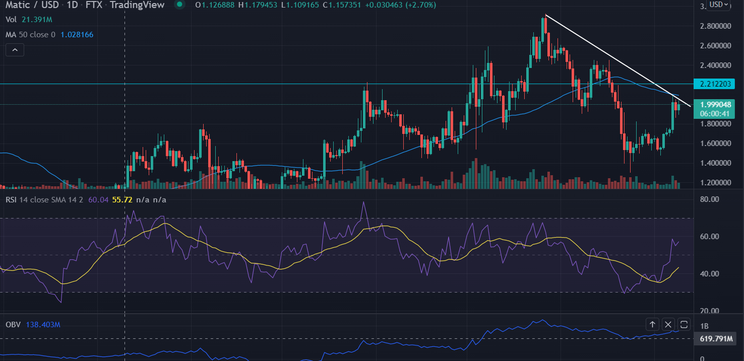 As of press time, MATIC/USD is trading at $2.01, up 3.85% for the day. Polygon records a drop in volume at $1.4 billion with the current market cap of $15 billion as per the CoinmarketCap.