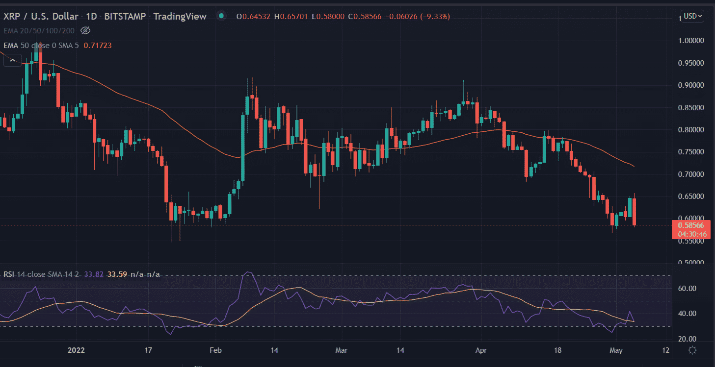 On the daily chart, the XRP price has a roller coaster ride in today’s session. In April the token depreciated by almost 35%. The downward momentum pushed the price near to the multi-month lows as the selling momentum still continued in May. In addition to that, the price is exposed to further downside risk as the 50-day SMA is still making the recovery a challenge for the asset. The major support area belongs to $0.55, rupture below may lead to an additional drop in price.