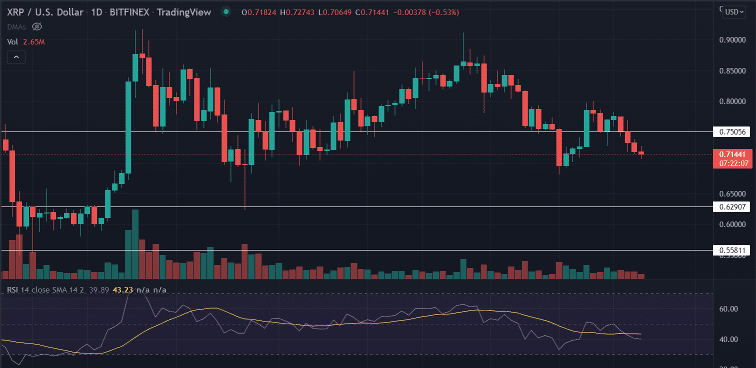 As of writing, XRP/USD is trading at $0.71, down 2.86% for the day. The 24-hour trading volume of the sixth-largest cryptocurrency is holding at $1,532,867,643 as updated by the CoinMarketCap.
