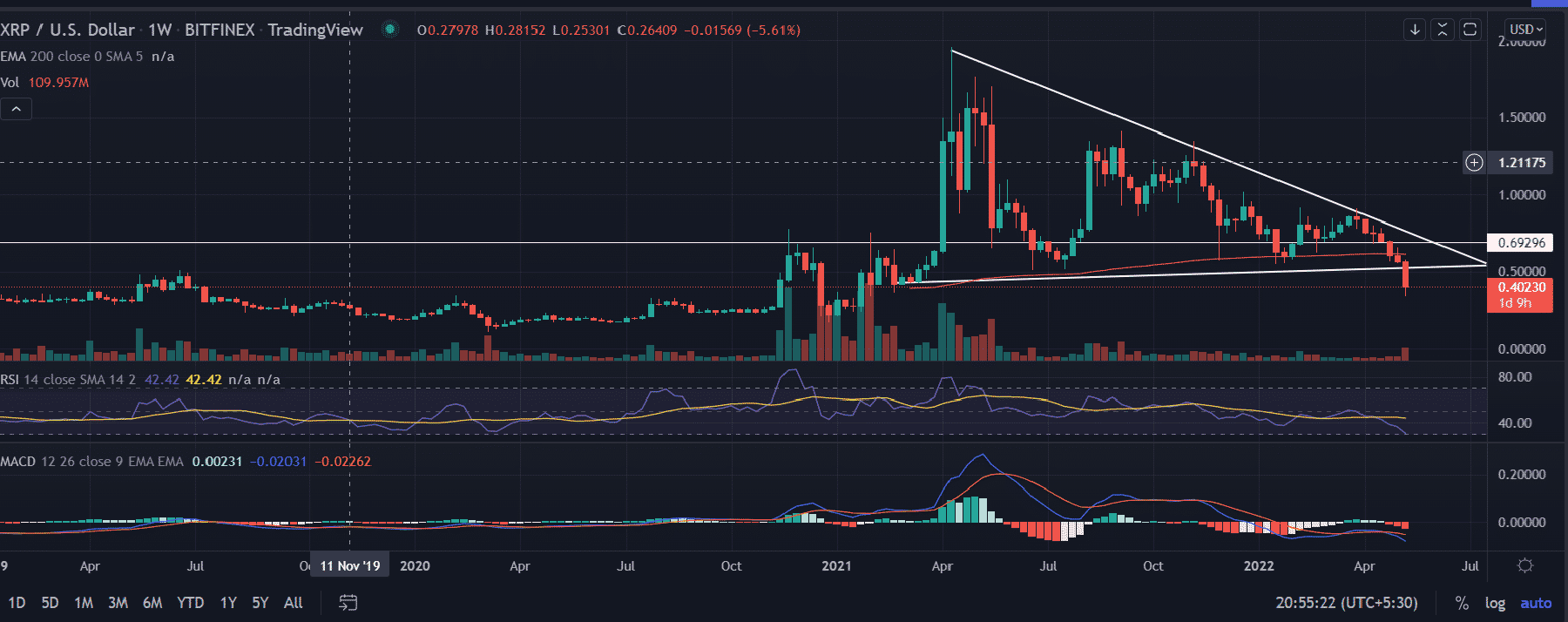 On the weekly chart, the XRP price traded in a descending triangle pattern since April 21. The buyers tested the descending trend line thrice indicating the presence of the upside pressure. To add to the depreciating currency XRP dropped below the critical 200-day EMA (Exponential Moving Average) at $0.61 as the May series began. In addition to that, a break of the baseline of the triangle pattern pushed the price to test the lows last seen in February 2021.