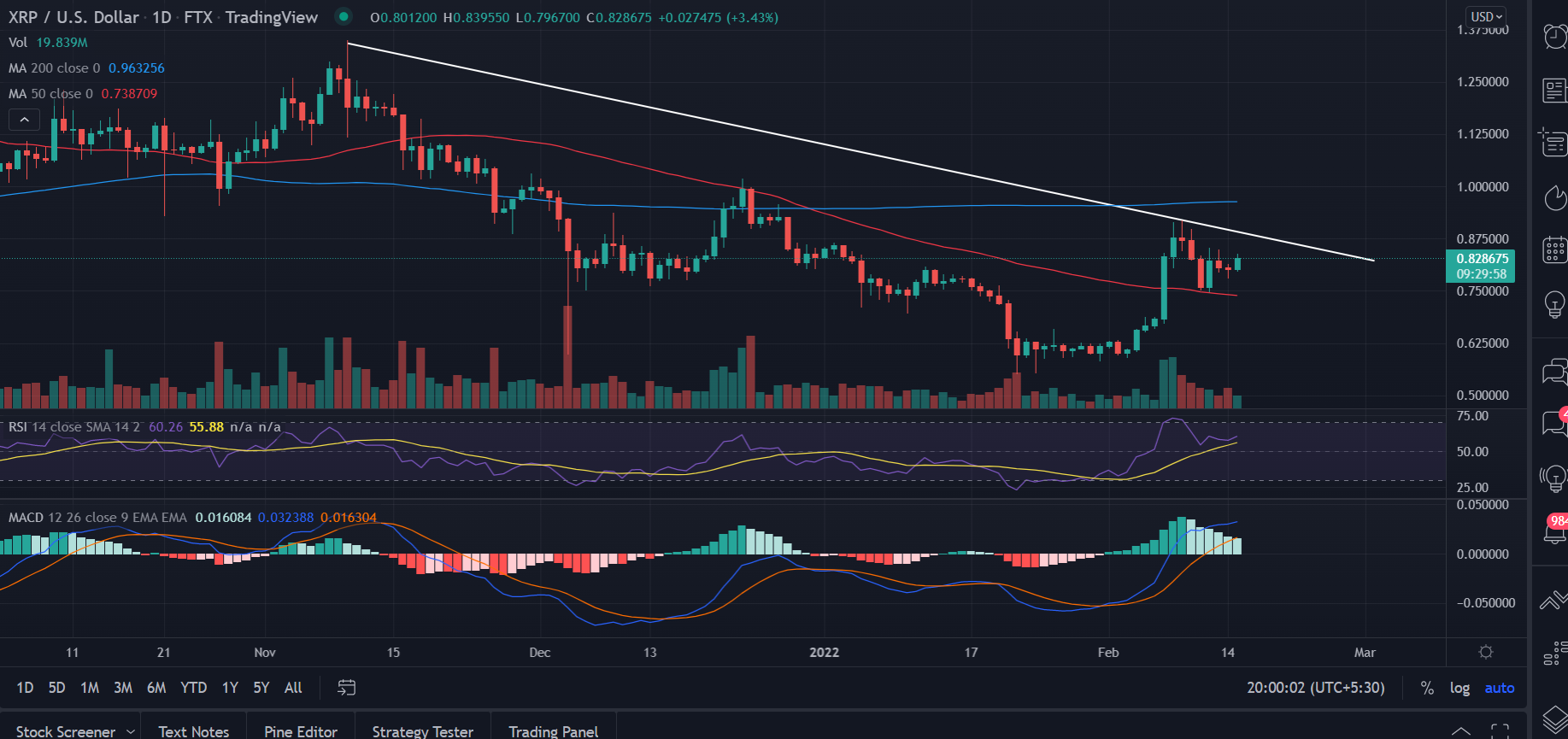 As of writing, XRP/USD is trading at $0.83, up more than 3% for the day. As per CoinMarketCap, the sixth-largest cryptocurrency by market capitalization the 24-hour trading volume stands at $2,369,168,895 with a loss of 14%.