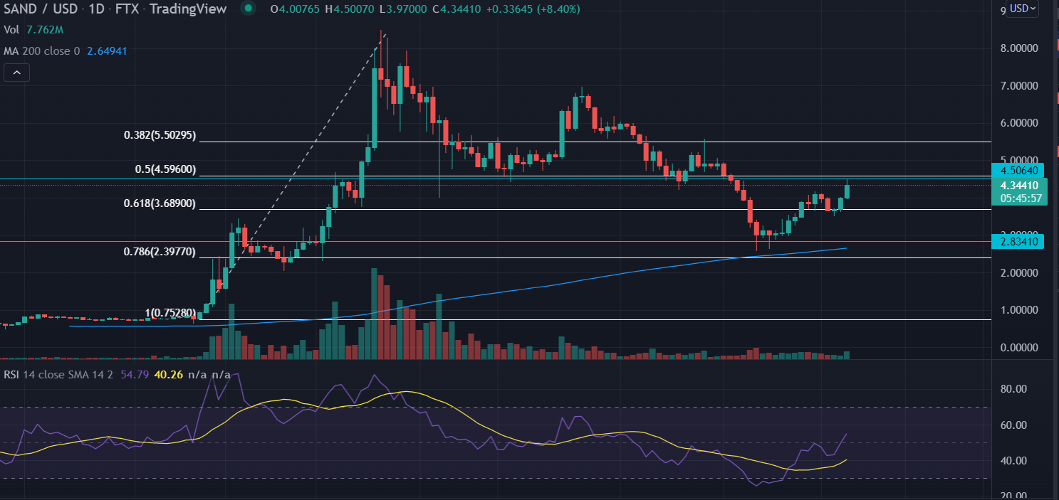 Sandbox (SAND) Price Test 0.50% Fibonacci Retracement At $4.5