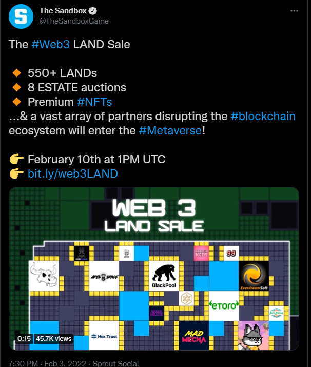 The Sandbox is a 3D blockchain-based Metaverse. The fundamental reason behind the recent rally is the announcement from Web3 upcoming LAND sale scheduled for February 10th. The sale will include over 550+ LAND, 8 ESTATE auctions, and Premium NFTs.