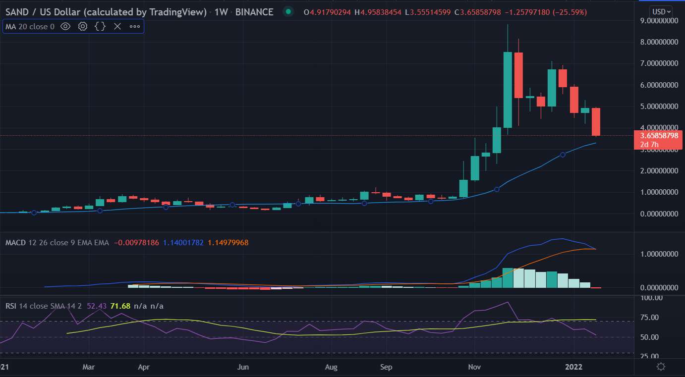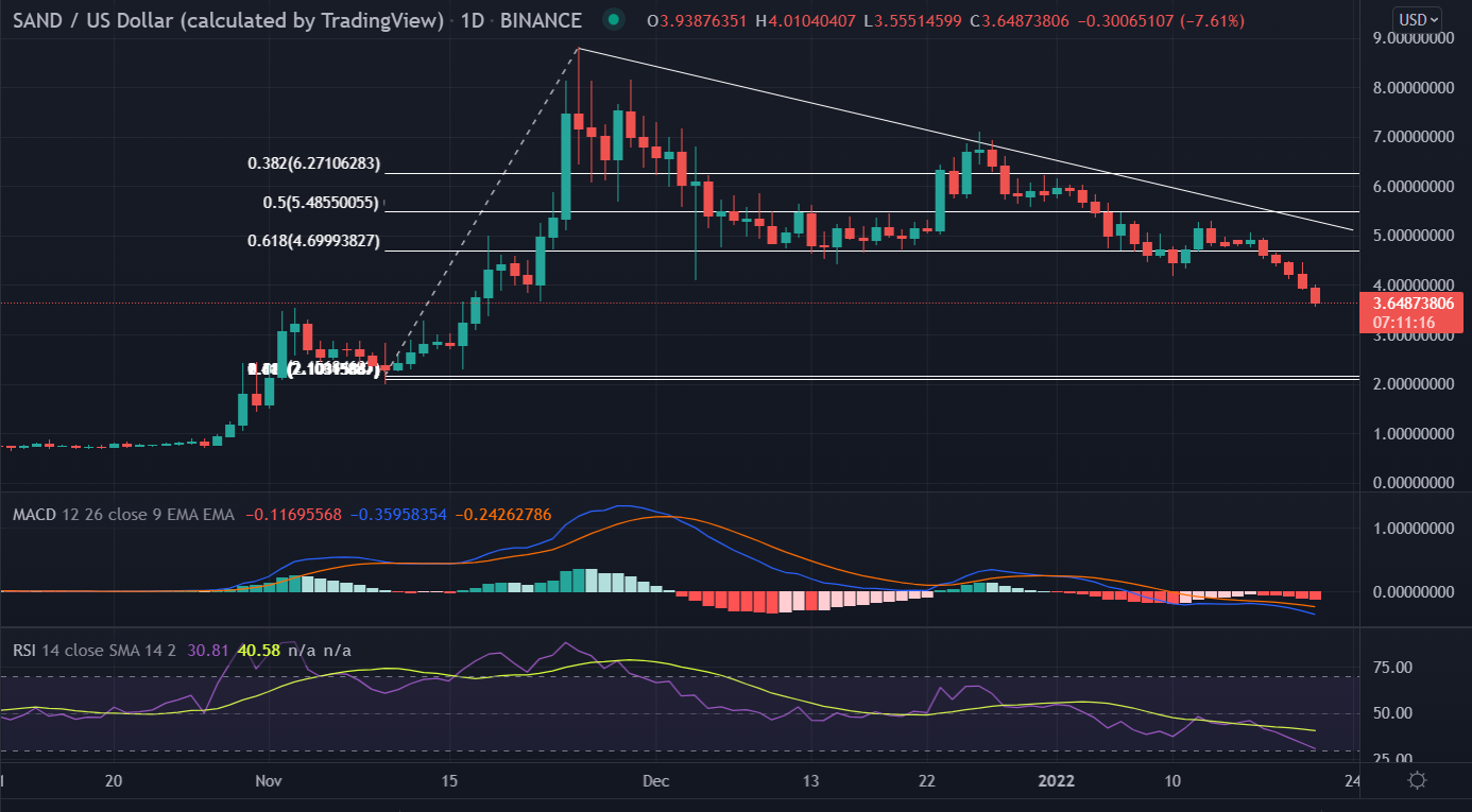 Sandbox (SAND) price remains under pressure on Friday, continuing the four-day fall. The price swing in between $5.48 and $4.6.Finally, the price has broken on January 17 with a total of a 28% decline. At the time of writing, the Sandbox price is trading at $3.68 with a 24-hour trading volume of $988,924,904.