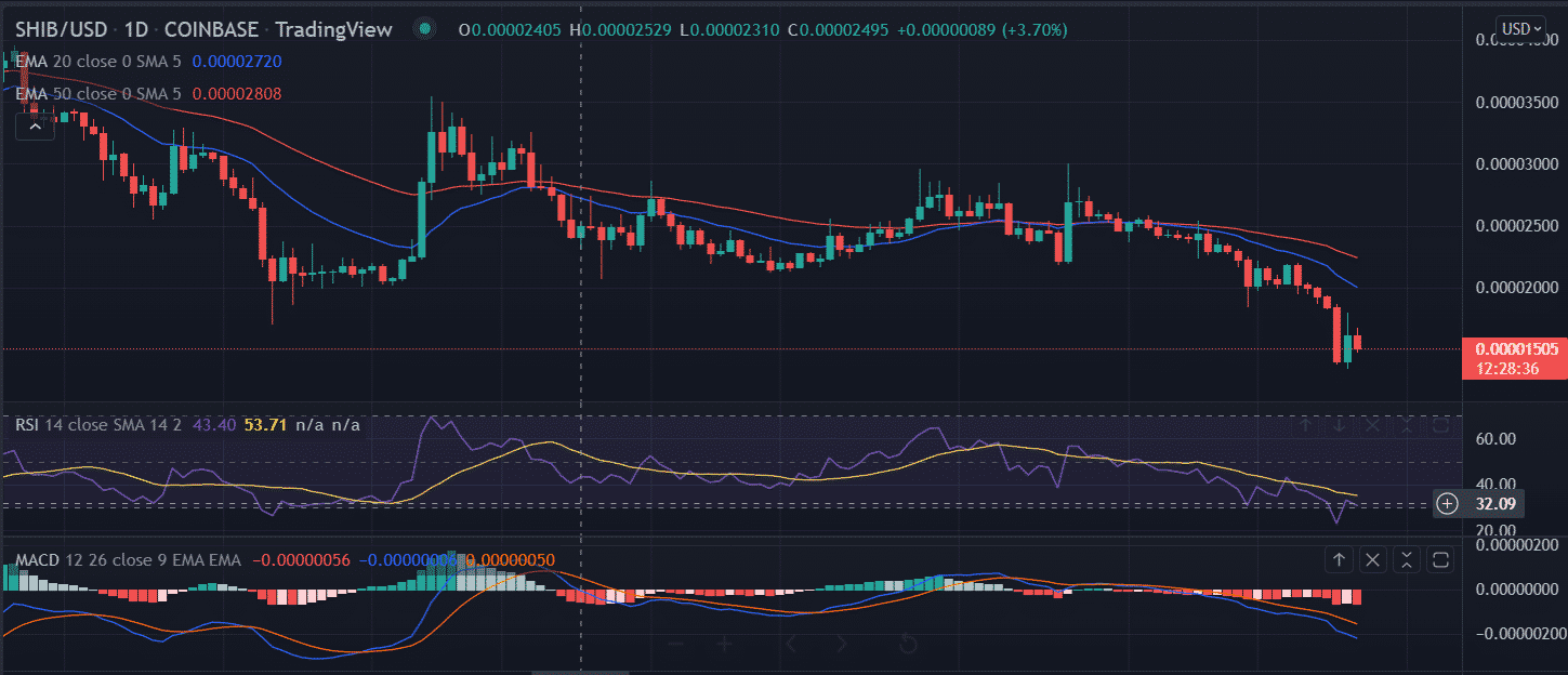 SHIB price indicates that the token has the potential to rise from the current levels, as it is sustaining near the record lows. In a month’s time, SHIB lost 50% from the highs of $0.000030 made on April 12. The price is trading near the four-month lows. On the larger-time frame, there is a fair chance of recovery.