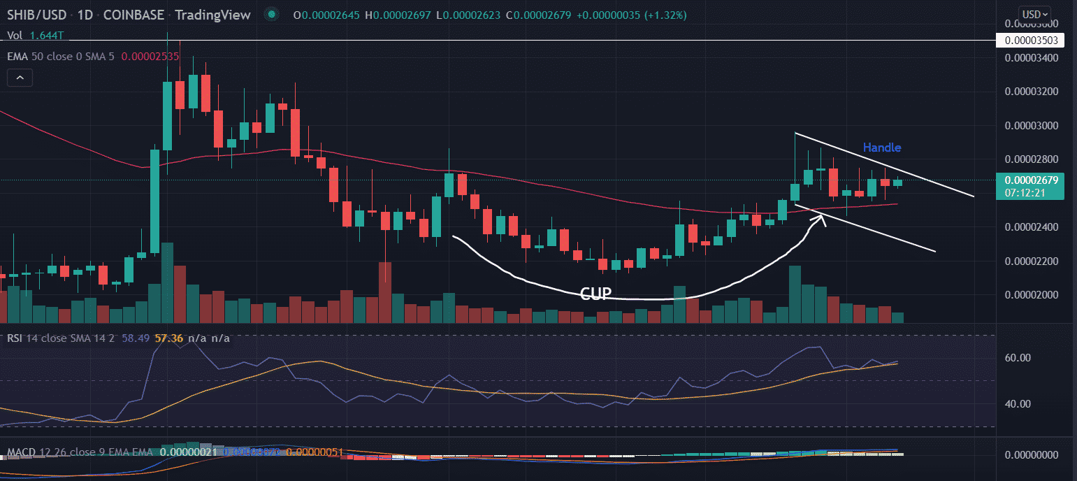 On the daily chart, SHIB’s price consolidates below $0.000028 for the past few sessions. The price has formed a bullish reversal formation ‘ cup and handle’. The asset found relaible support around $0.20, while the price retraced from the highs of $0.000029.