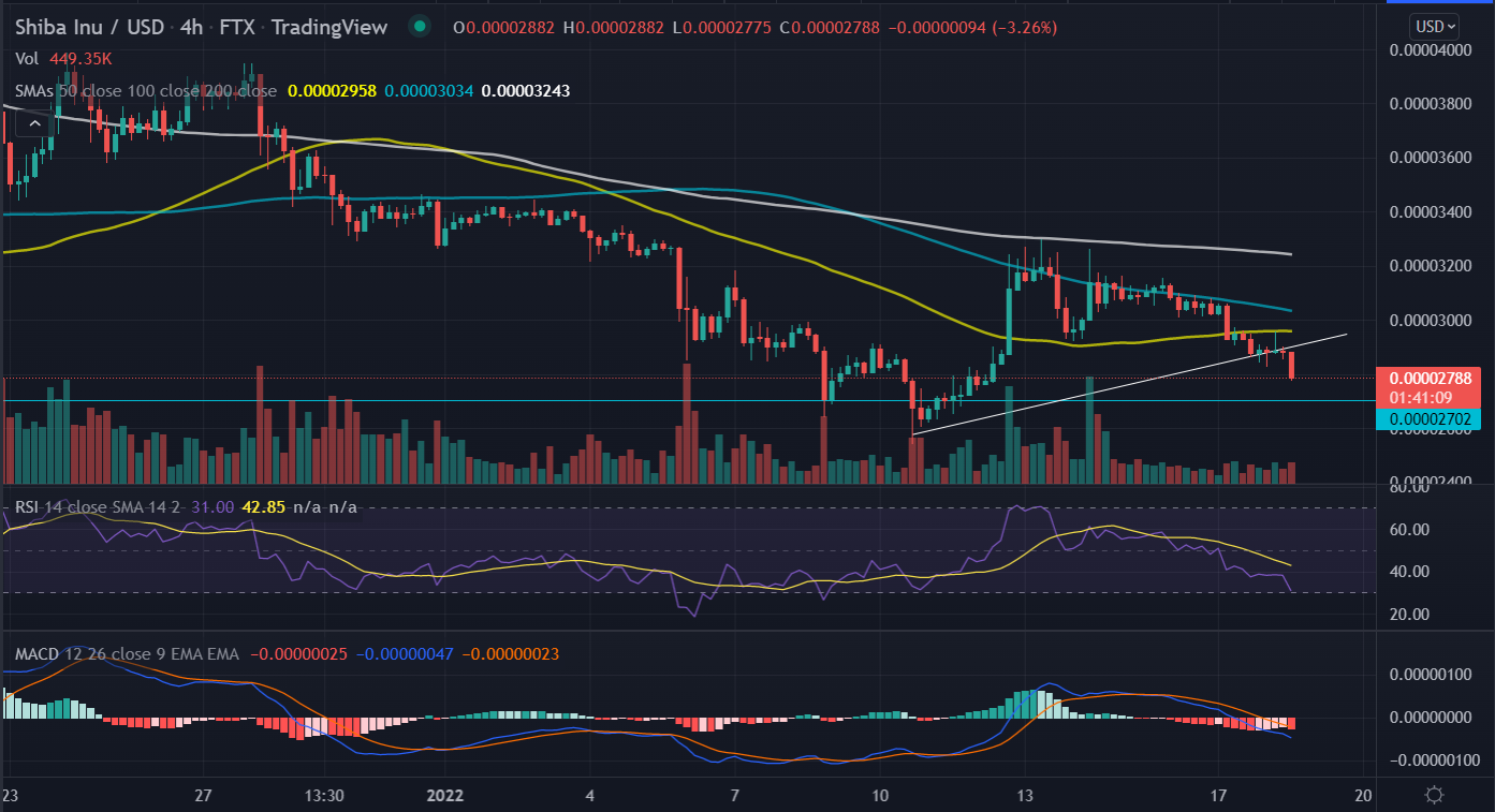 The ascending trend line from the lows of $0.0000254 has been broken on the 4-hour chart. A black candle indicates higher selling pressure in the short term. The immediate support could be found at the horizontal support level of 0 $.000027.