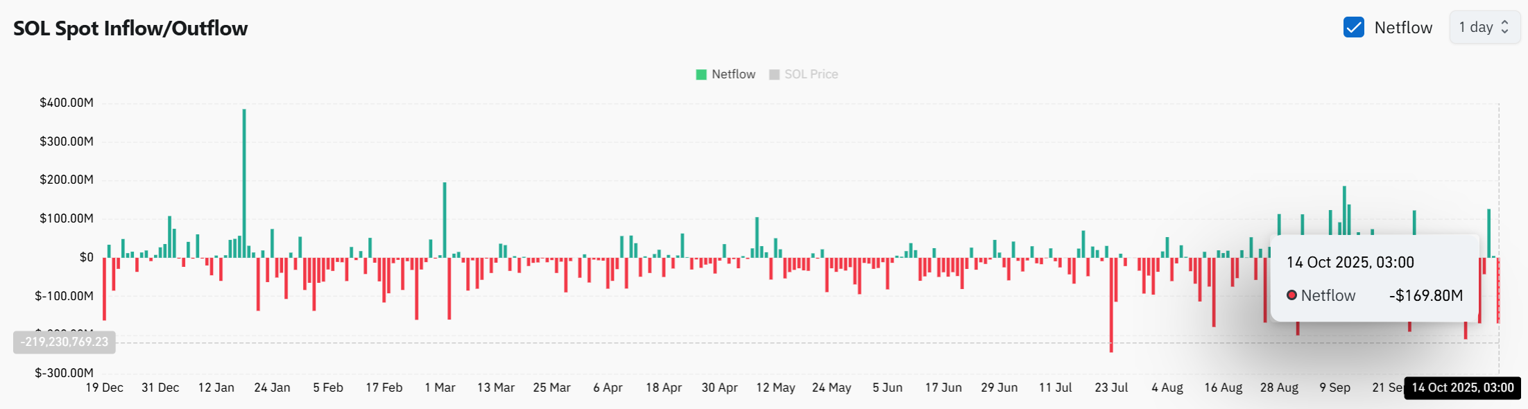 Whale activity has surged significantly, with data showing $169 million worth of SOL outflows from exchanges, according to CoinGlass. Such large-scale withdrawals typically indicate accumulation, as major investors move assets to private wallets for long-term holding.