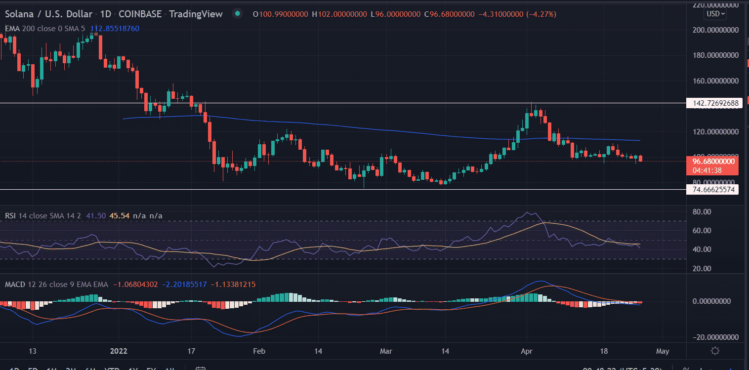 SOL price falters after witnessing gains in the previous session. The price has been stuck up in a short-term range for the past two weeks. However, the downside is well guarded near $100 morphing it into a crucial trading level.