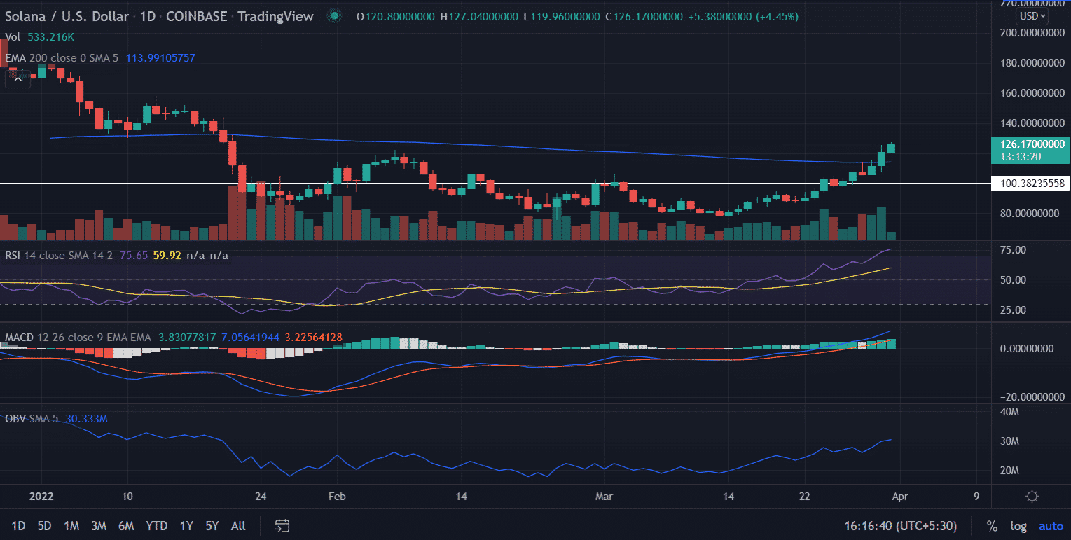 On the daily chart, the SOL price tested $124.0 for the first time in 2022. The price recently breached the critical 200-EMA (Exponential Moving Average) since being tested on January 22. This is a strong sign for the continuation of the upside momentum.