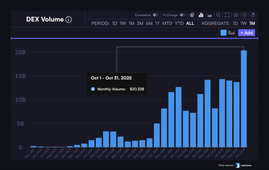 Meanwhile, monthly DEX trading volume skyrocketed past $20 billion — its highest in history — emphasizing growing liquidity and trading depth.