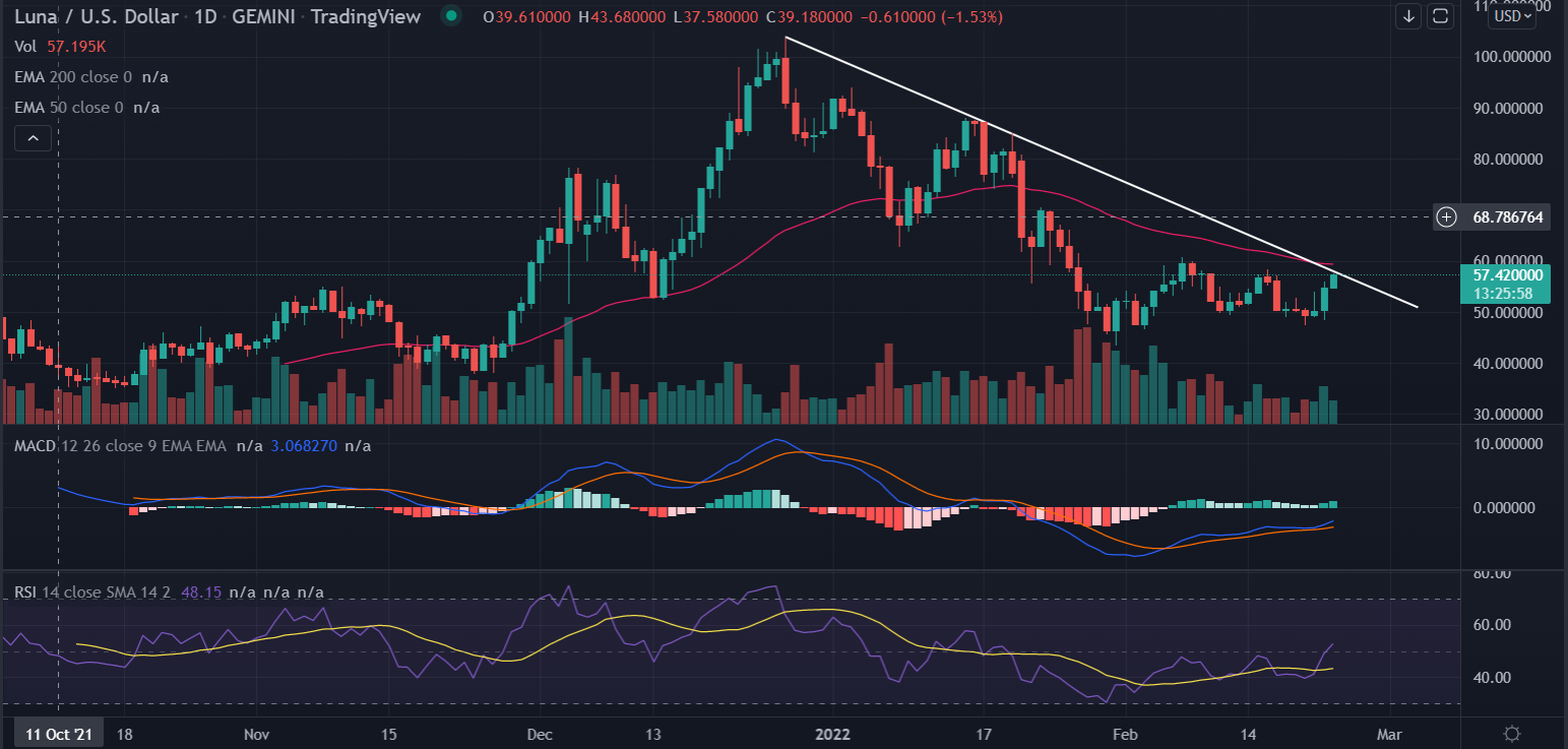 On the daily chart, Terra (LUNA) has dropped 52% from the record highs made on December 27 at 103.68. After testing the 2022 lows at $43.45, the pair has been trading in a tight range of $45 and $60.0 since late January.