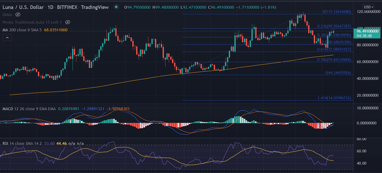 On the daily chart, the LUNA price retraced 45% after testing record highs at $119.44 on April 5. The price after briefly falling below the 0.5% Fibonacci retracement level, which is extending from the lows of $43.87 bounced back to revisit the highs of $99.48.