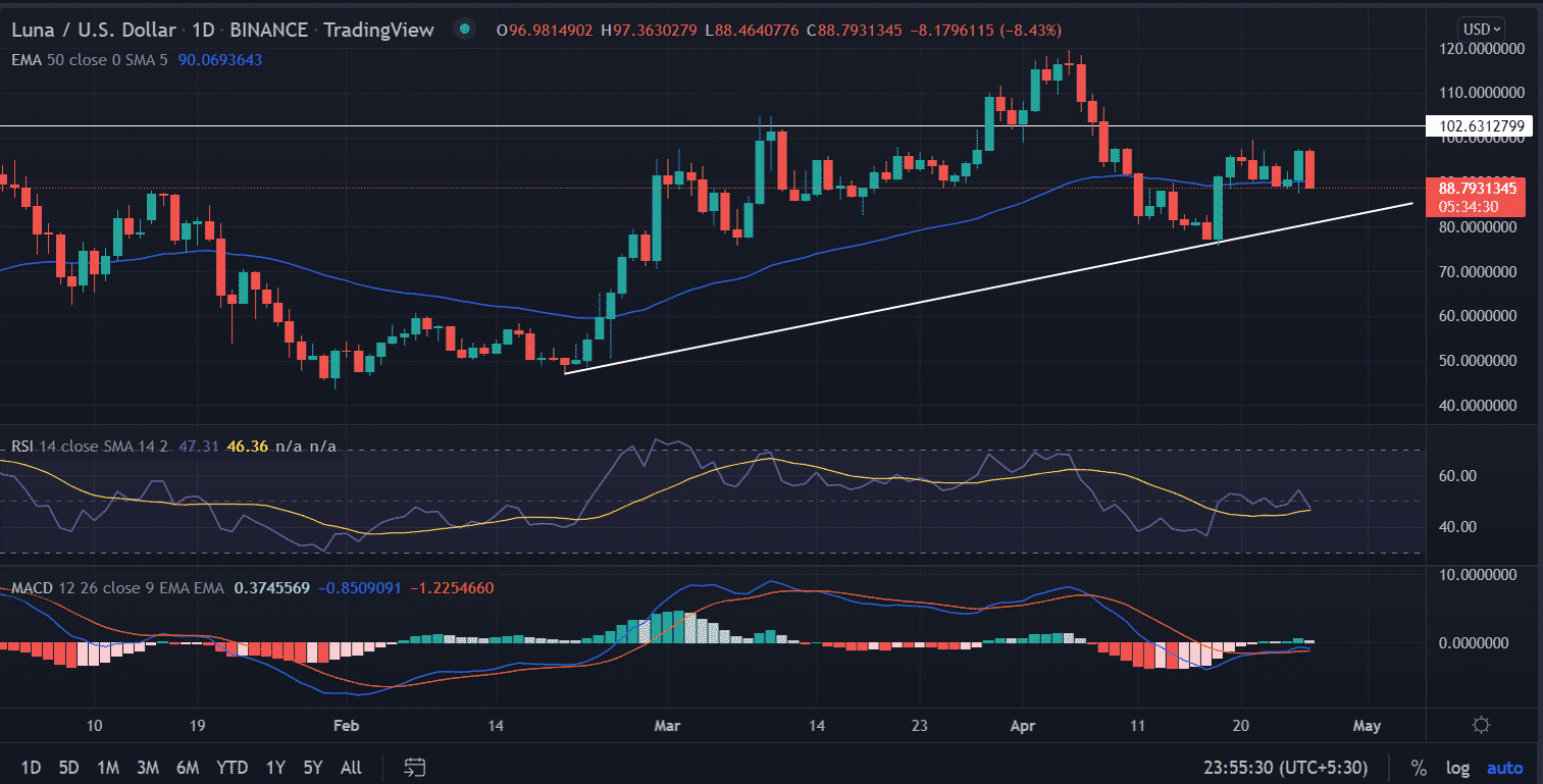 On the daily chart, the LUNA’s price command seems to be in the hand of bears since April 5. The price retraced nearly 35% from the record highs around $119.56 made on April 5. Further, the price slipped below the critical 50-day EMA on the way. Finally, the LUNA price rested near $77.