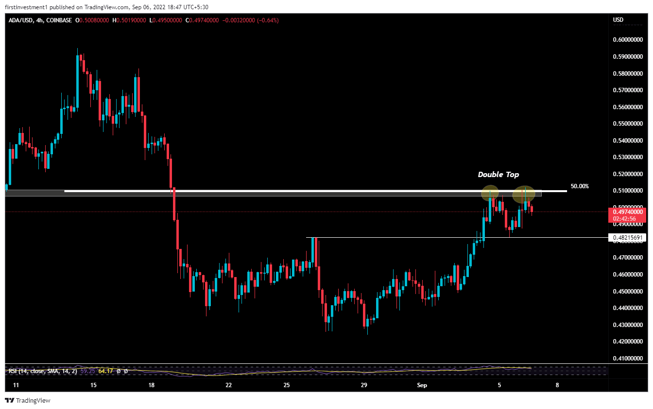 ADA price on the four-hourly chart formed a “Double Top” pattern, facing heavy resistance near its current highs. The price test the 50% Fib retracement level of the downward move from the $0.59 swing high to the $0.42 low. According to this pattern, if the price started to fall and closes below $0.48, then we can expect a good fall up to $0.46. But, there is a higher probability of the price breaking below its resistance level.