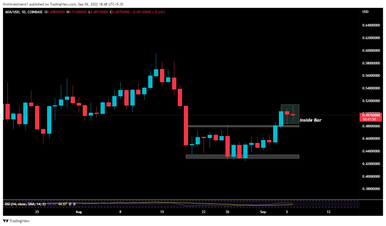 ADA is in play to test its previous swing high ($0.60) in the coming days. This week starts with a consolidation, forming the “Inside Candlestick” pattern. As the name suggests, an inside bar chart pattern engulfs the inside of a large candle(Bullish), some call it a mother bar. It’s a pattern that forms after a significant move (Upmove) in the market and represents a period of consolidation.