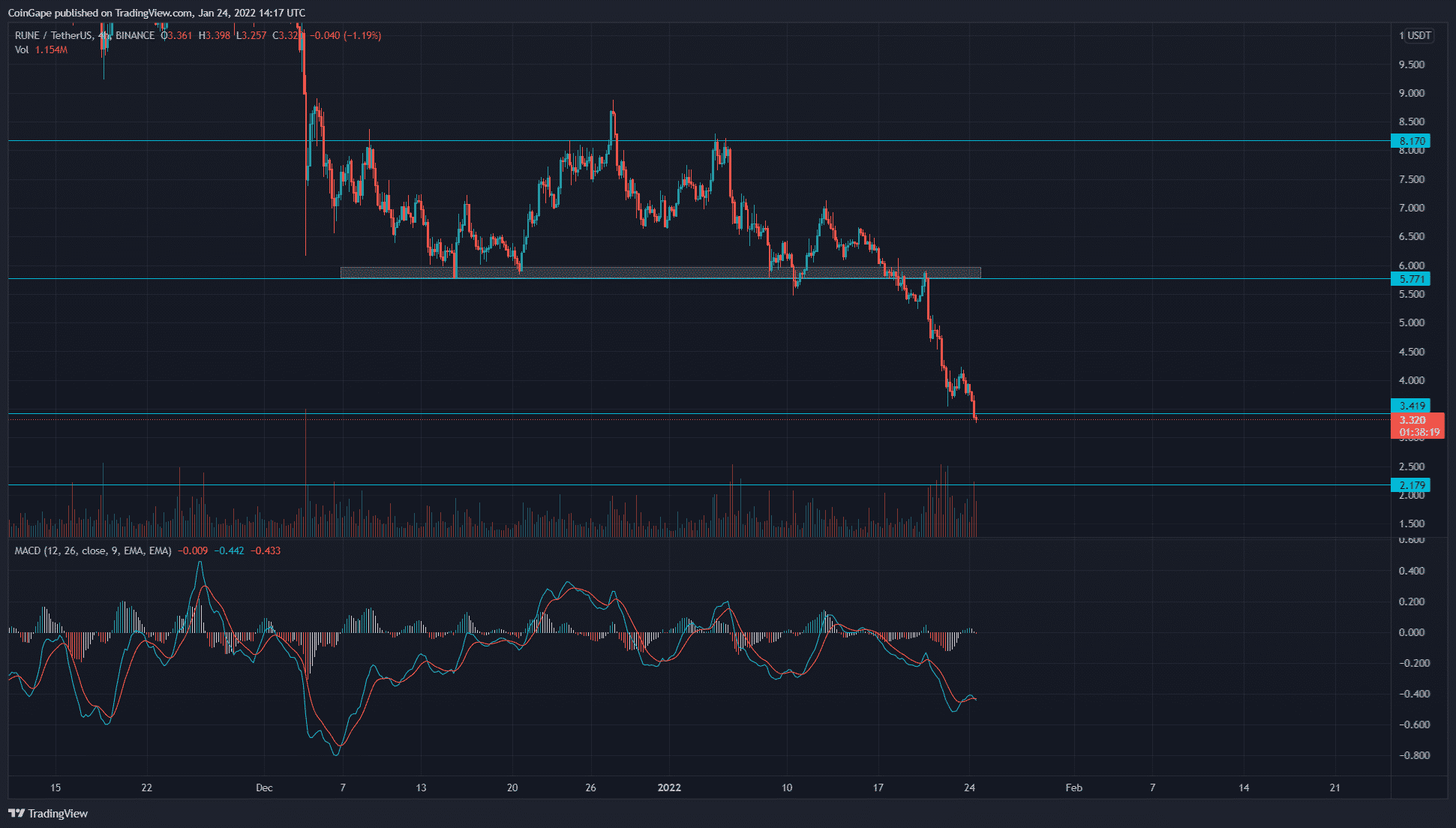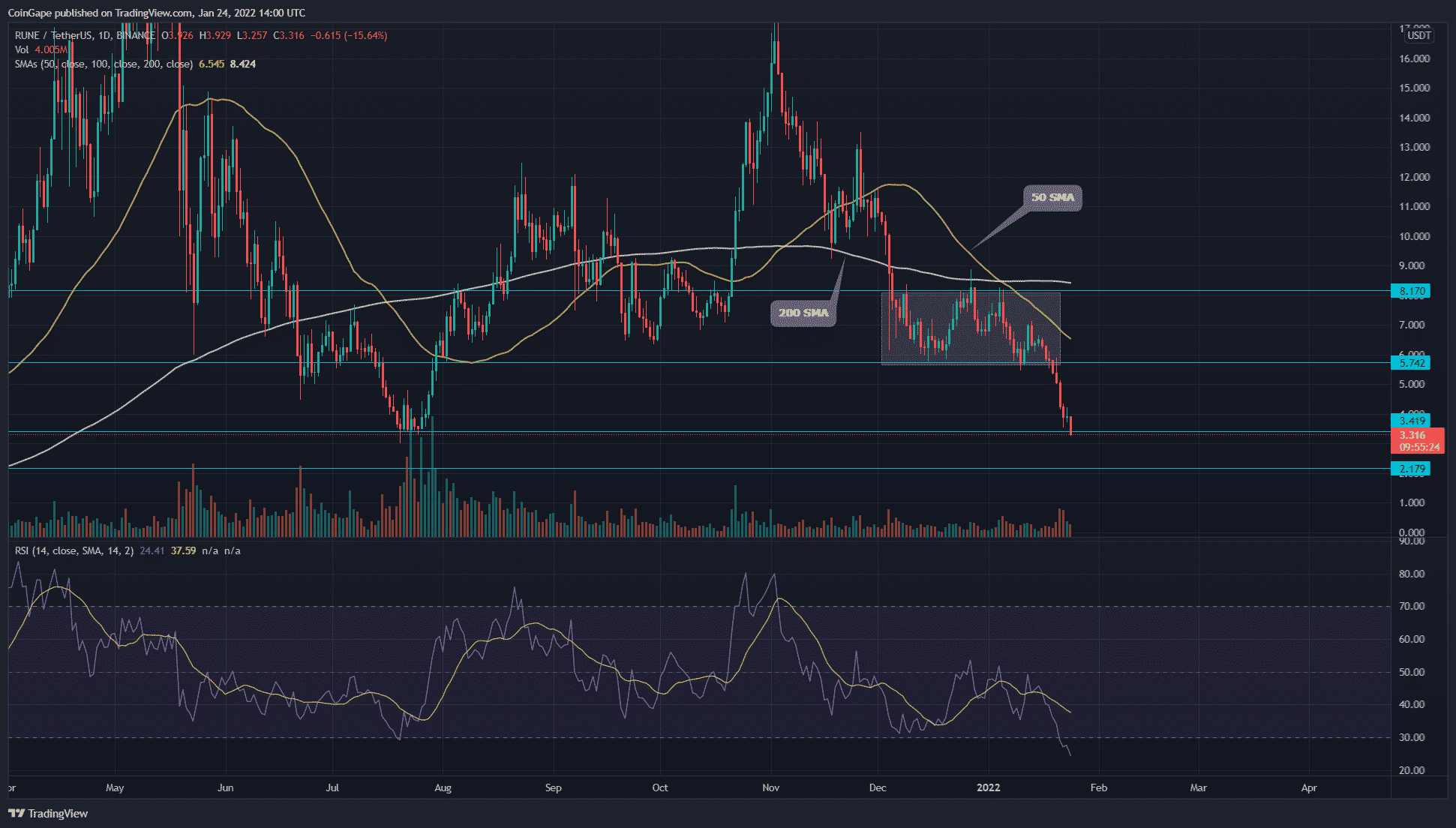 The panic selling in the crypto market has resulted in an extended correction in RUNE price. The coin lost its crucial support of $5.7, which majorly supported during December 2021 and early January. The RUNE price has devalued by 40% within a week and now challenges another key support of $3.35.