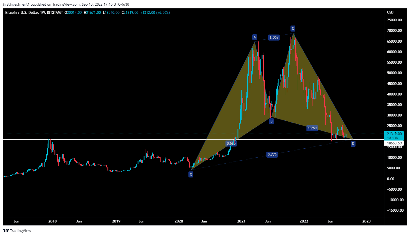 The second pattern, formed by BTC is the “Double Bottom” structure. On November 2021, the BTC price tested the all-time high of $69,000 & fell from there afterward. Since then Bitcoin has been in a downward spiral and hit the bottom in June 2022. The investors eroded 73% of their holding values.