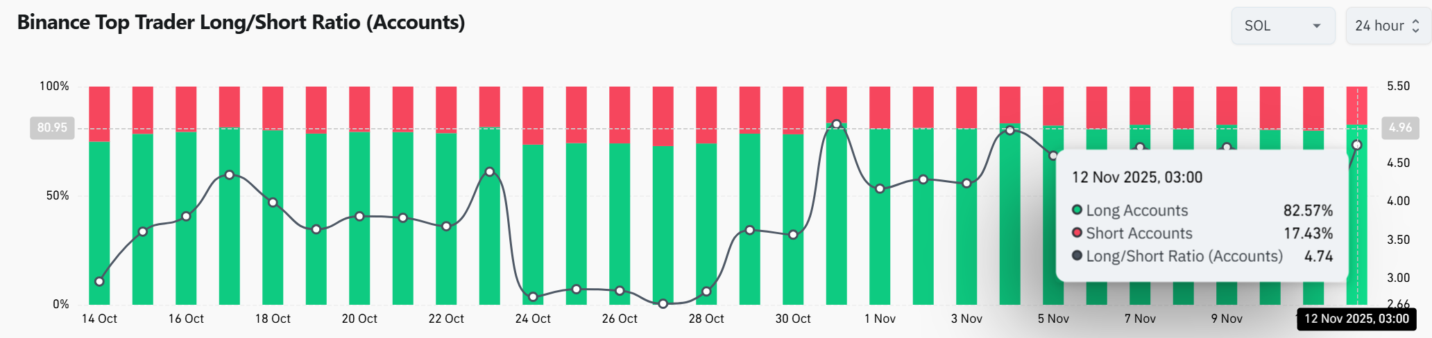 Data from CoinGlass shows that 82.57% of Binance top accounts are holding long positions on SOL price, while just 17.43% remain short. The long/short ratio now stands at 4.74, reflecting one of the strongest bullish tilts recorded in recent weeks.