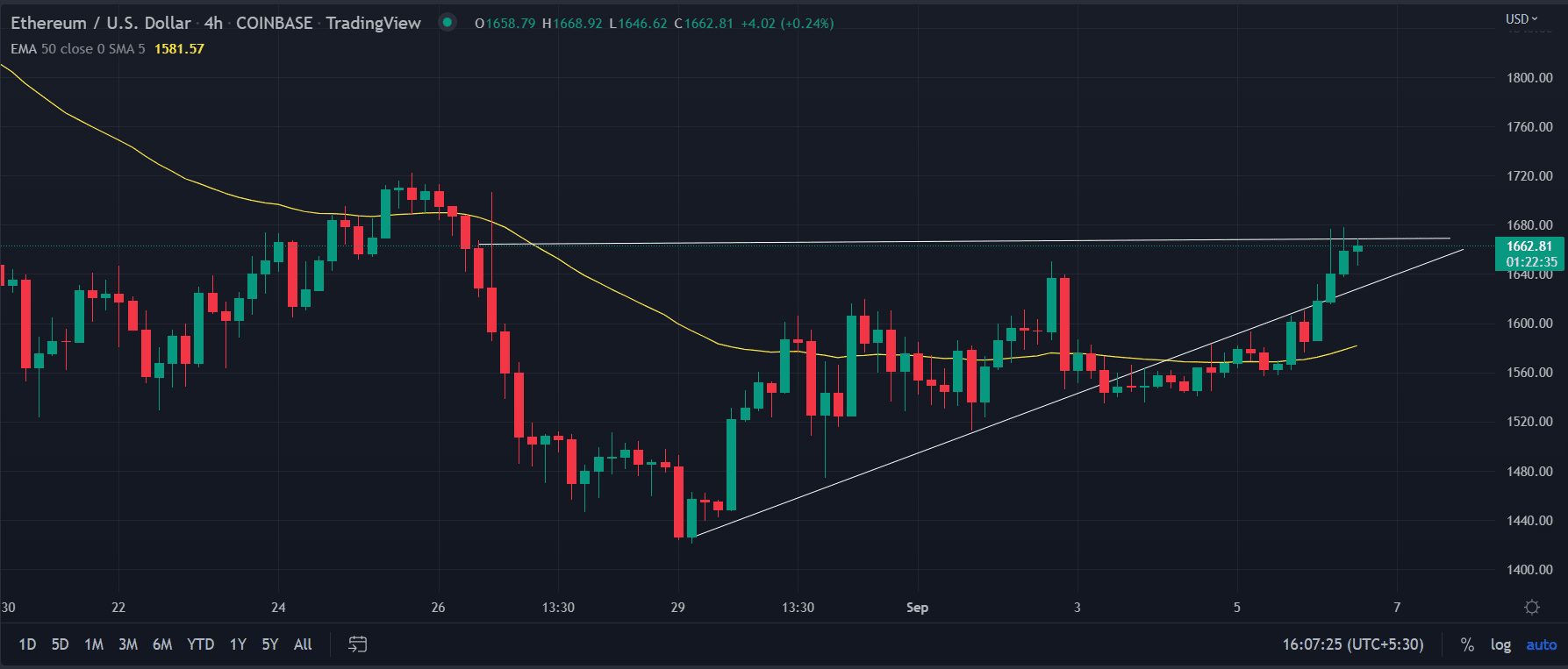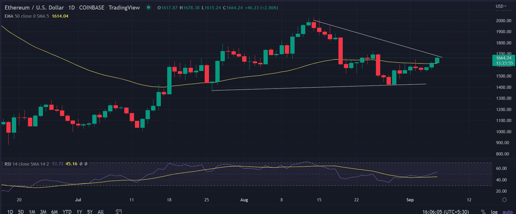 Taking support from $1,420 ETH gained more than 17% above $1,650. Currently, the price hovers near a short resistance barricade as it faces multiple rejections at this level. However, this time we expect the price would pierce this upside filter.