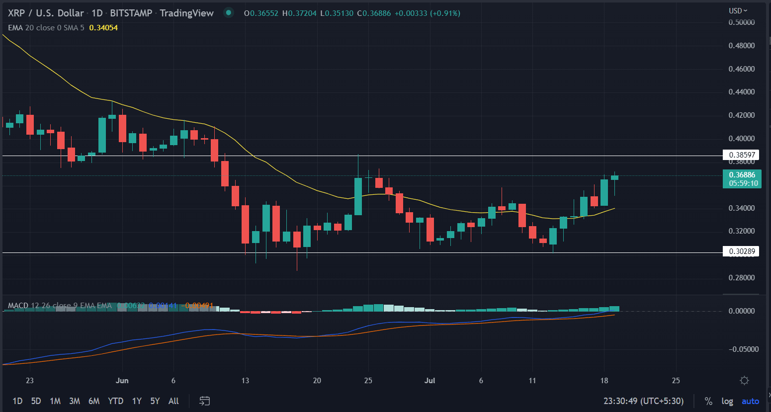 As the price breaks the 20-day EMA (Exponential Moving Average) at $0.33, added optimism to the ongoing price action enthusiasm. Above $0.38, the XRP bulls will target the highs of June 10 at $0.41 amid sustained buying pressure.