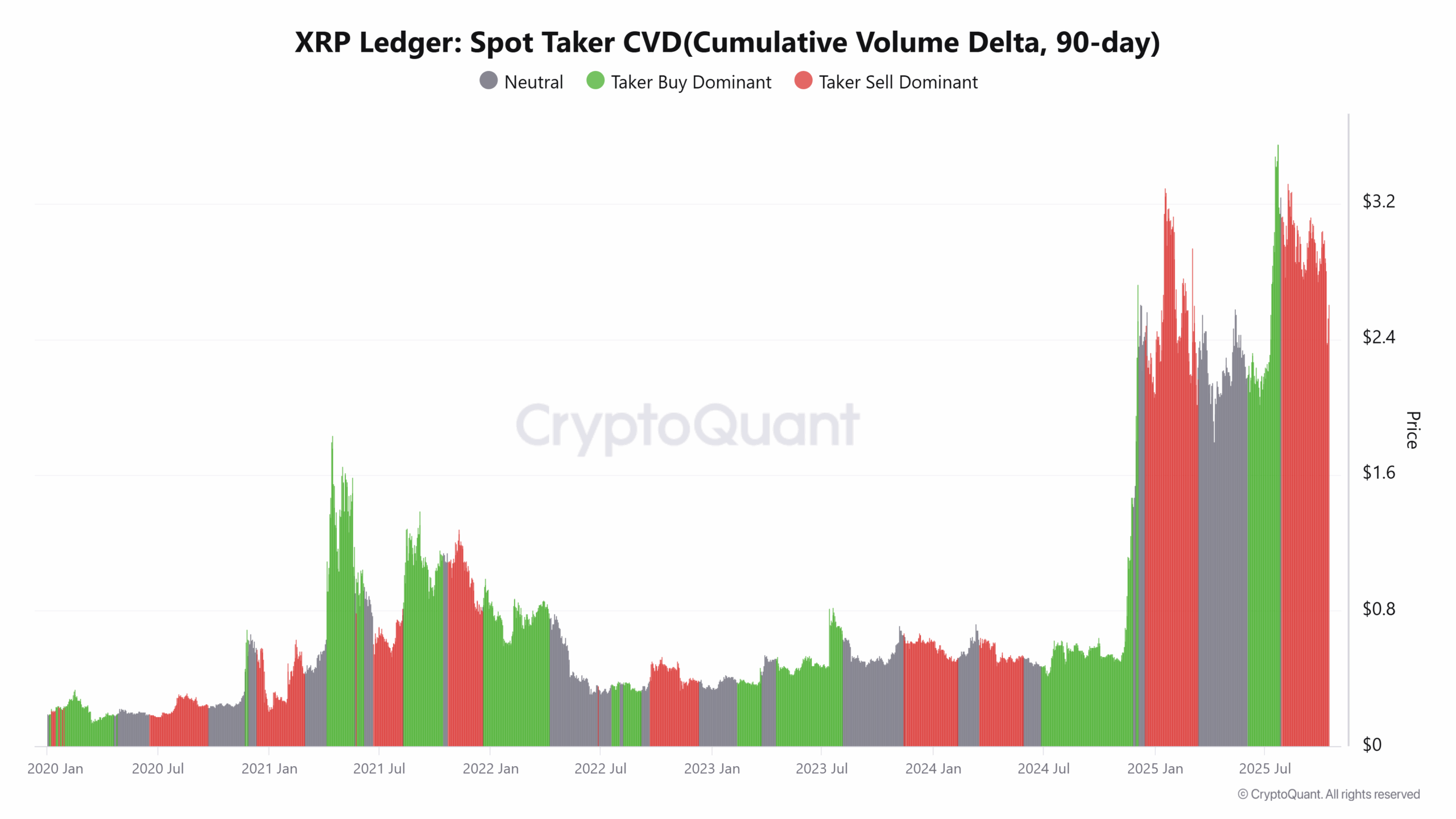 Spot Taker CVD data confirms a Taker Sell dominance, reinforcing the bearish bias across spot markets. This shows market sellers remain aggressive while buyers reduce exposure. The imbalance keeps the XRP price exposed to extended downside risk. However, a potential rebound could emerge once the token retests the $2.00 demand level.